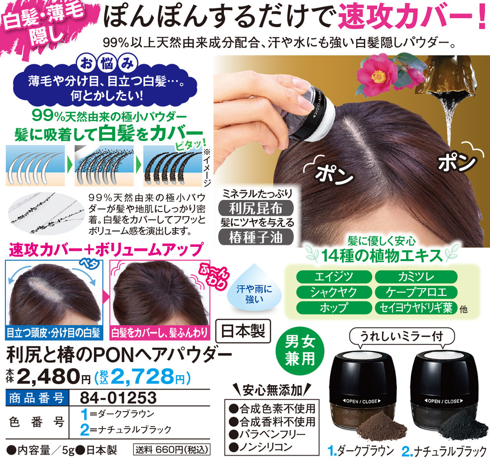 99%以上天然由来成分配合、汗や水にも強い白髪隠しパウダー。