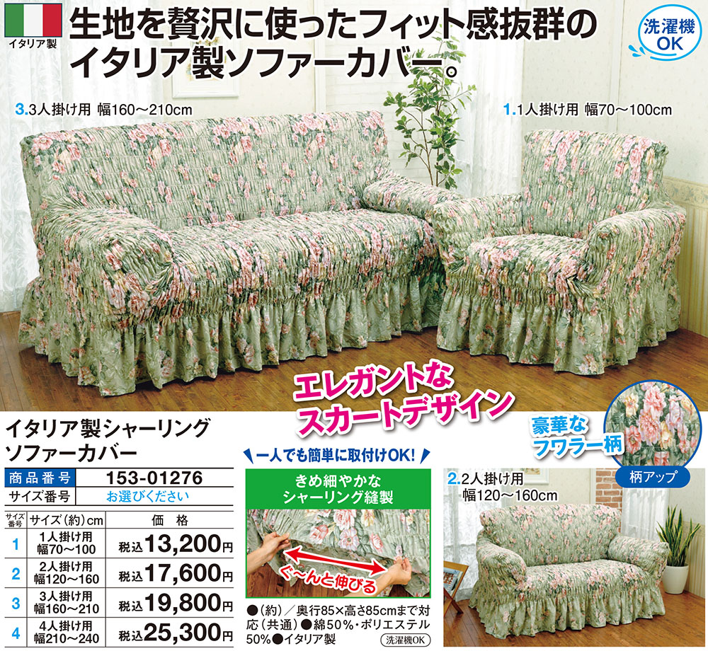●ヨーロッパで大人気のイタリア製のソファーカバーです。 ●今までのソファーカバーとは全く違い、きめの細やかな縫製のシャーリング製法によりソファ-へのフィット感は抜群です。 ●ローズブーケのフラワーデザインが地のグリーンカラーとよくマッチしています。お部屋の雰囲気をエレガントに演出します。 ●裾はスカートデザインで優しい表情が素敵です。 ●立体的な加工が施してあり通気性もあるので肌触りが良く湿気の多い日本の四季にもぴったり合います。