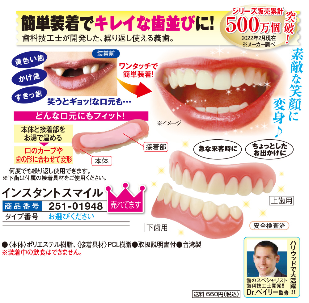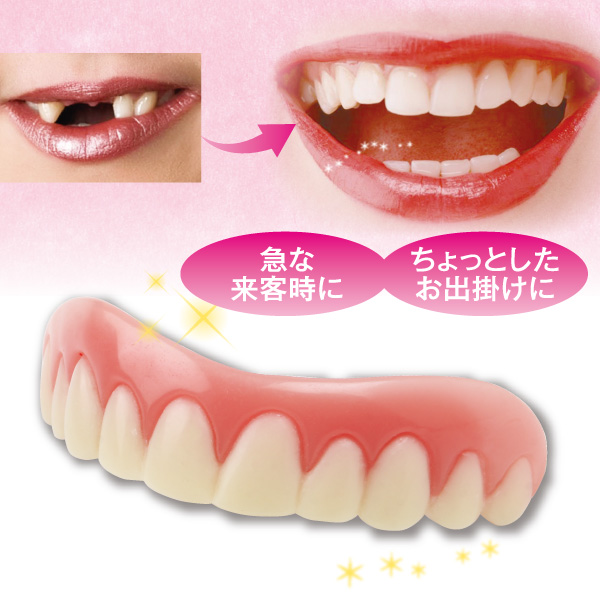 歯科技工士が開発した、繰り返し使用できる義歯 笑えない口元の悩みにワンタッチ装着!瞬時にキレイな歯並びへ! ・急な来客に ・ちょっとしたお出掛けに 本体と接着部をお湯で温め、歯のカーブに合わせてフィッティング。口のカーブや歯の形に合わせて変形し、どんな口元にもフィット。何度でも繰り返し使用できます。 ●着脱簡単!ワンタッチ式! ●素敵な笑顔に自信がつく! ◆安全検査済み ハリウッドで大活躍!! 歯のスペシャリストDr.ベイリー監修