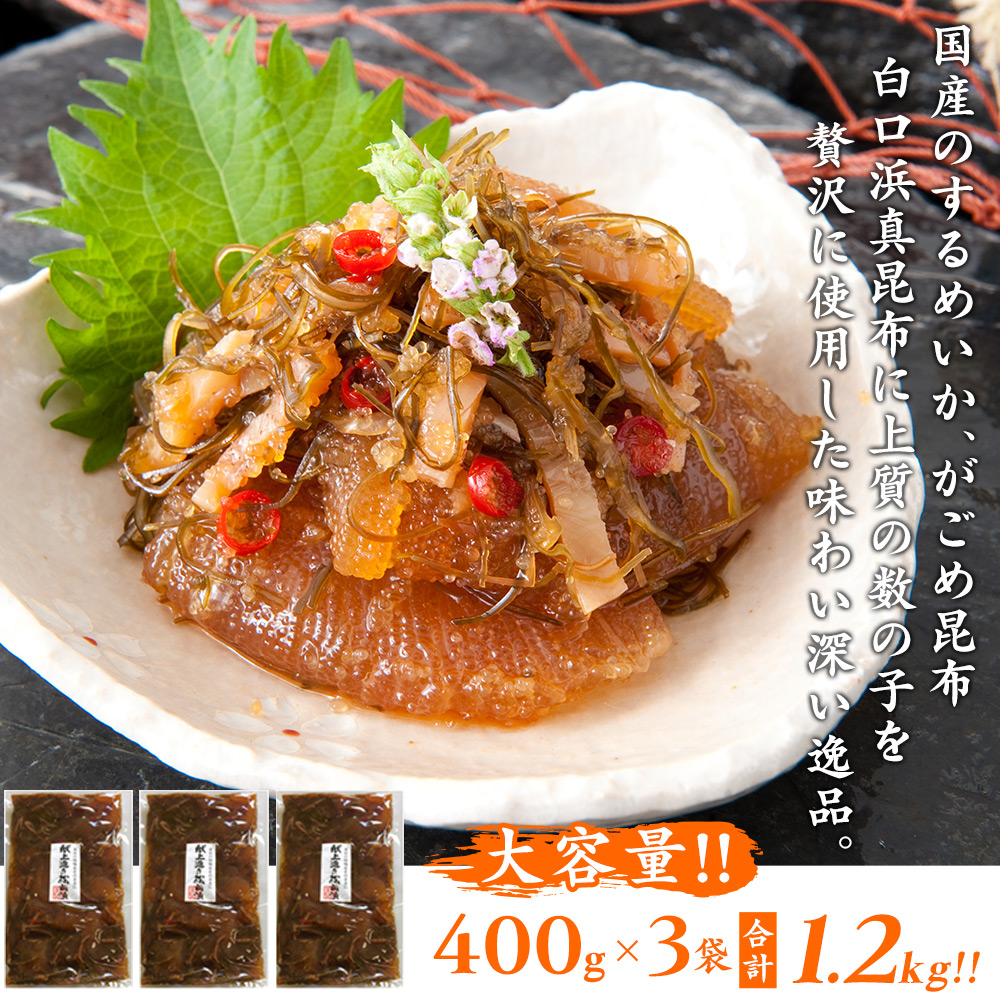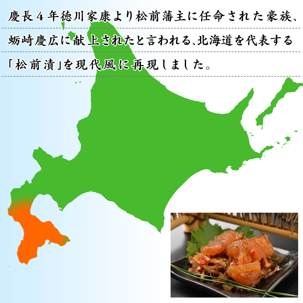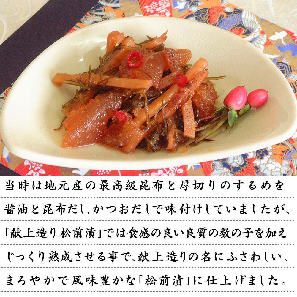 国産のするめいか、がごめ昆布白口浜真昆布に上質の数の子を贅沢に使用した味わい深い逸品。 慶長4年徳川家康より松前藩主に任命された豪族、蛎崎慶広に献上されたと言われる、北海道を代表する「松前漬」を現代風に再現しました。 当時は地元産の最高級昆布と厚切りのするめを醤油と昆布だし、かつおだしで味付けしていましたが、「献上造り松前漬」では食感の良い良質の数の子を加えじっくり熟成させる事で、献上造りの名にふさわしい、まろやかで風味豊かな「松前漬」に仕上げました。 大容量400g×3袋=1.2kg!