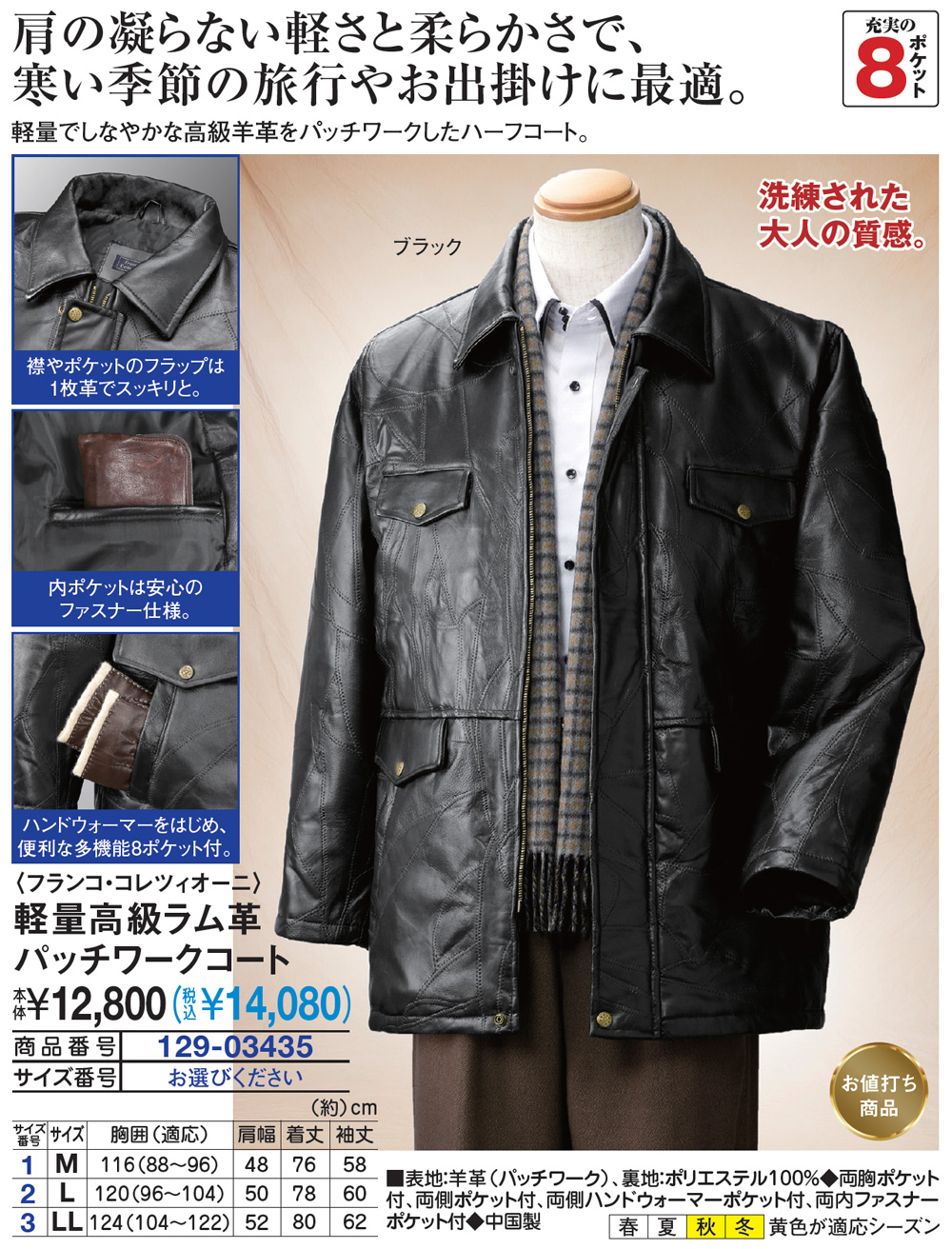 肩の凝らない軽さと柔らかさで、寒い季節の旅行やお出掛けに最適! 洗練された大人の質感。 充実の8ポケット 軽量でしなやかな高級羊革をパッチワークしたハーフコート。 襟やポケットのフラップは1枚革でスッキリと。 内ポケットは安心のファスナー仕様。 ハンドウォーマーをはじめ、便利な多機能8ポケット付。