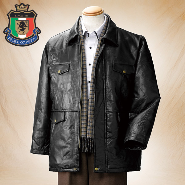 【サイズ(約)】 胸囲(適応)、肩幅、着丈、袖丈 <M>116(88~96)cm、48cm、76cm、58cm <L>120(96~104)cm、50cm、78cm、60cm <LL>124(104~122)cm、52cm、80cm、62cm ■表地:羊革(パッチワーク)、裏地:ポリエステル100% ◆両胸ポケット付、両側ポケット付、両側ハンドウォーマーポケット付、両内ファスナーポケット付 ◆中国製