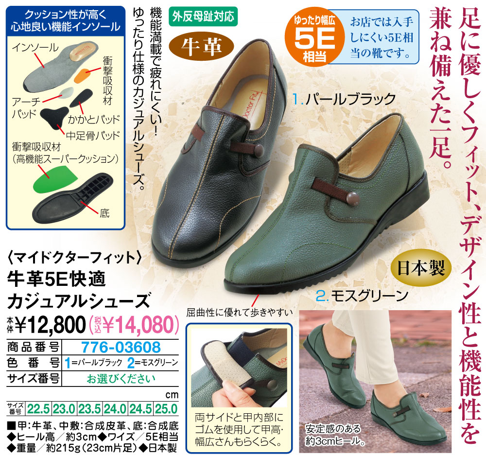 足に優しくフィット、デザイン性と機能性を兼ね備えた一足! 機能満載で疲れにくい! ゆったり仕様のカジュアルシューズ。 屈曲性に優れて歩きやすい 安定感のある約3cmヒール。 両サイドと甲内部にゴムを使用して甲高・幅広さんもらくらく。 クッション性が高く心地良い機能インソール ●ゆったり幅広5E相当:お店では入手しにくい5Eのシューズです。 ●外反母趾対応 ●牛革