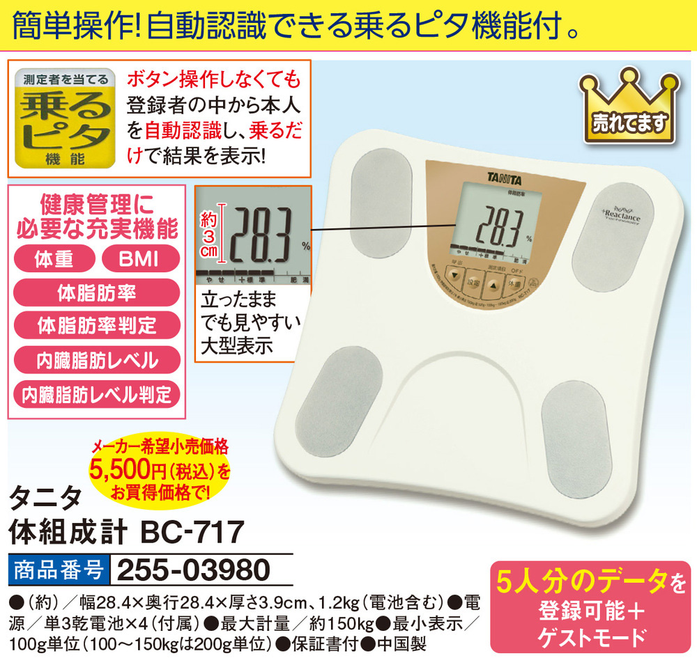 簡単操作!自動認識できる乗るピタ機能付! \売れてます/ 【乗るピタ機能(測定者を当てる)】 ボタン操作しなくても登録者の中から本人を自動認識し、乗るだけで結果を表示! 【健康管理に必要な充実機能】 ●体重 ●BMI ●体脂肪率 ●体脂肪率判定 ●内臓脂肪レベル ●内臓脂肪レベル判定 立ったままでも見やすい大型表示 5人分のデータを登録可能+ゲストモード