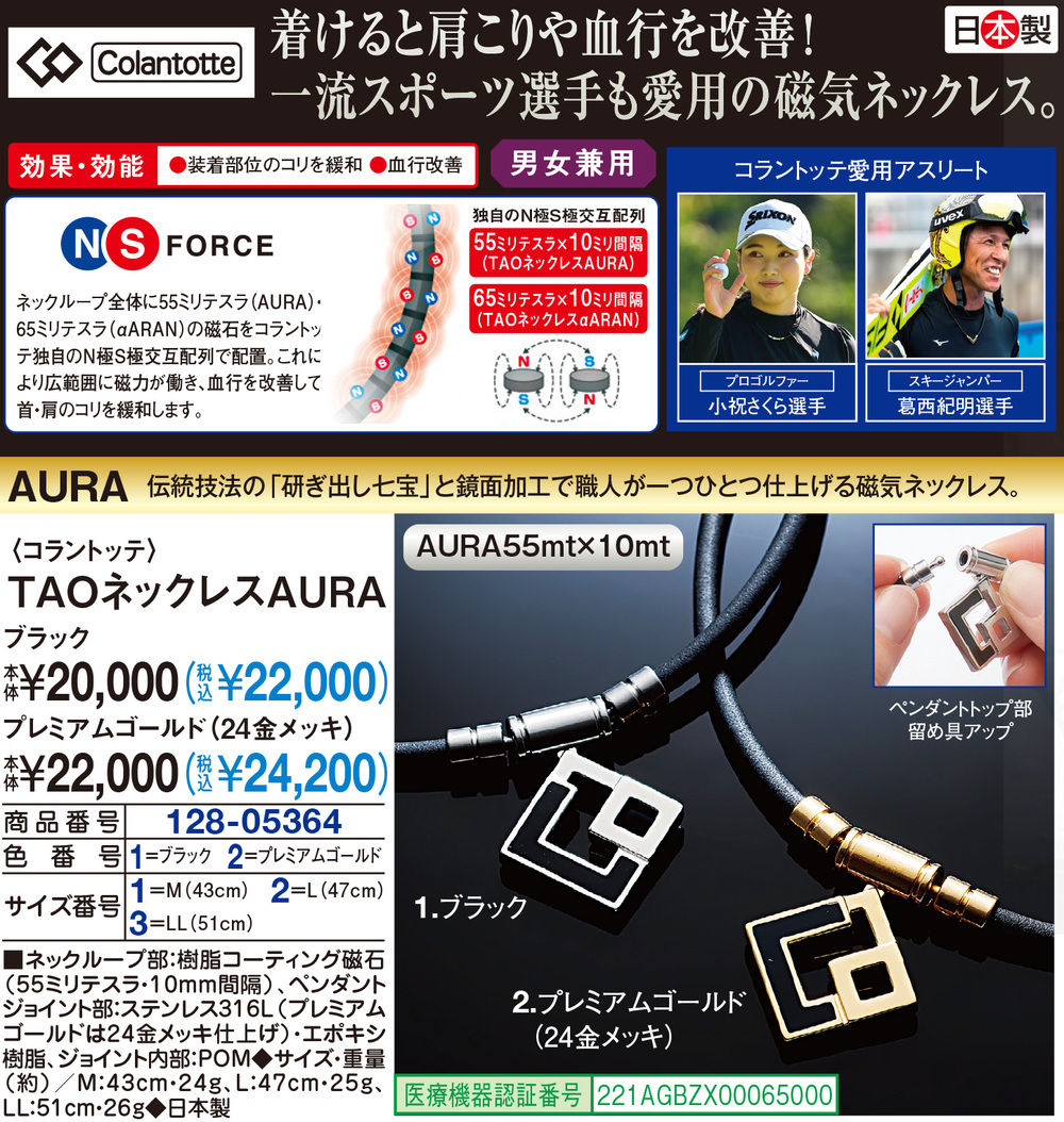 ネックループ全体に55ミリテスラ(AURA)・65ミリテスラ(αARAN)の磁石をコラントッテ独自のN極S極交互配列で配置。これにより広範囲に磁力が働き、血行を改善して首・肩のコリを緩和します。