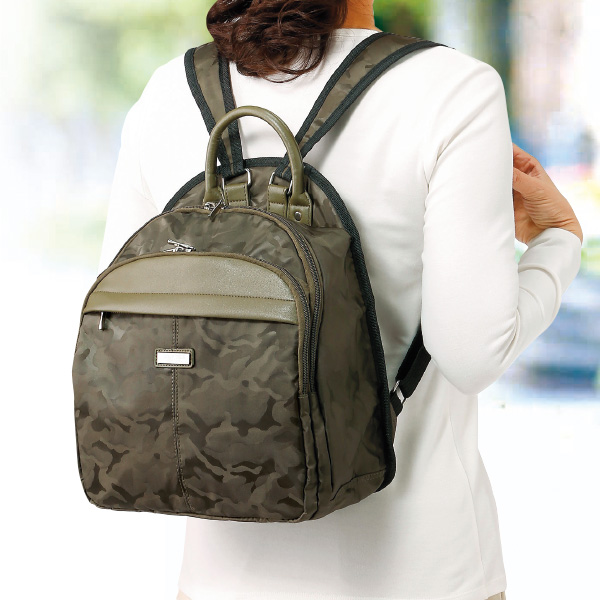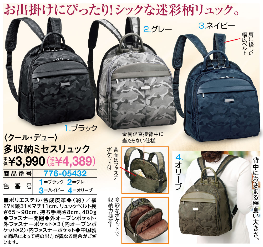 お出掛けにぴったり!シックな迷彩柄リュック! 背中におさまる程良い大きさ。 肩に優しい幅広ベルト 金具が直接背中に当たらない仕様 背面はファスナーポケット付 多彩なポケットで収納力抜群!