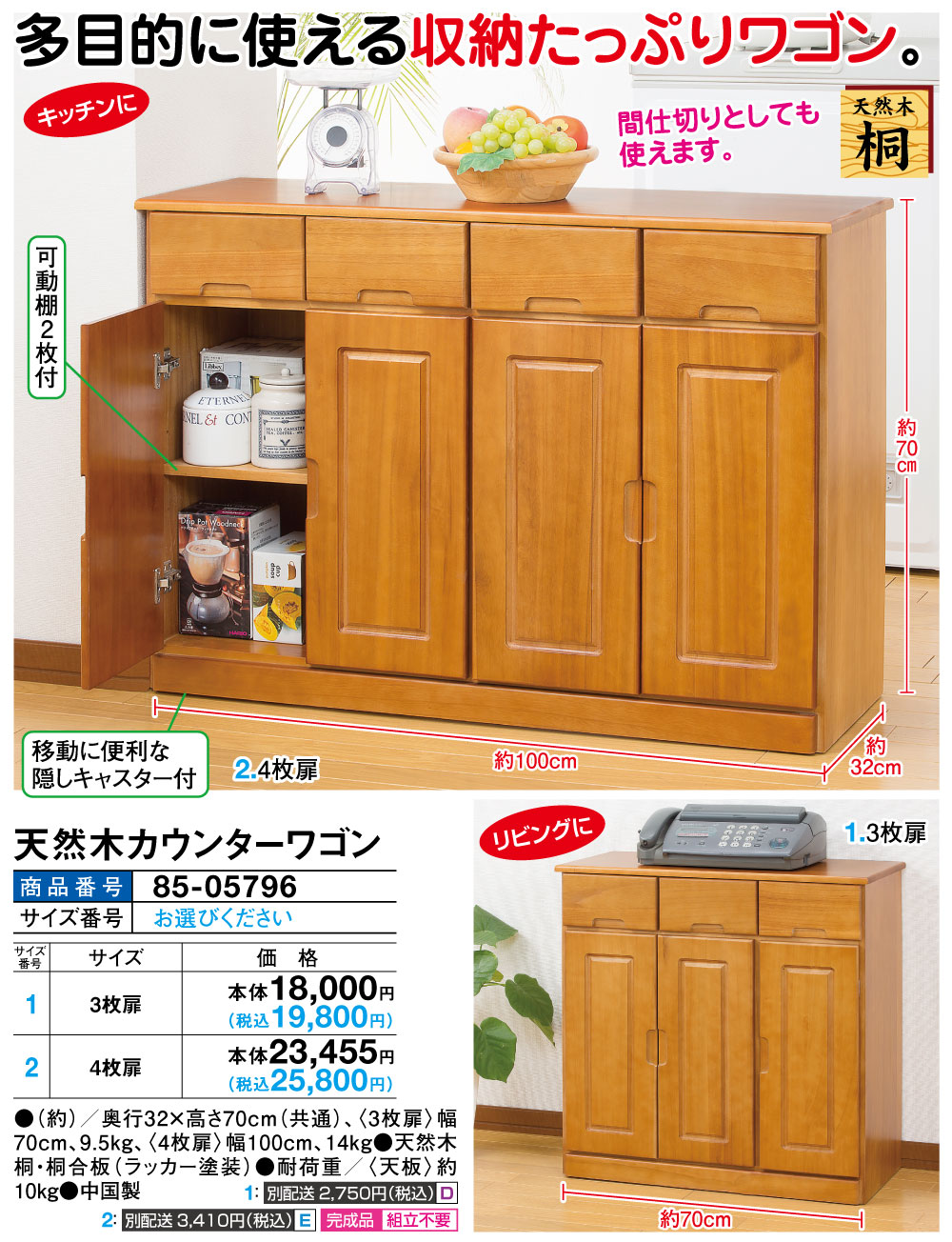●(約)/奥行32×高さ70cm(共通)、<3枚扉>幅70cm、9.5kg、<4枚扉>幅100cm、14kg ●天然木桐・桐合板(ラッカー塗装) ●耐荷重/<天板> 約10kg ●中国製 ◆組立不要:完成品でお届けします