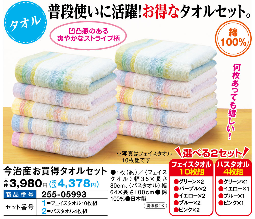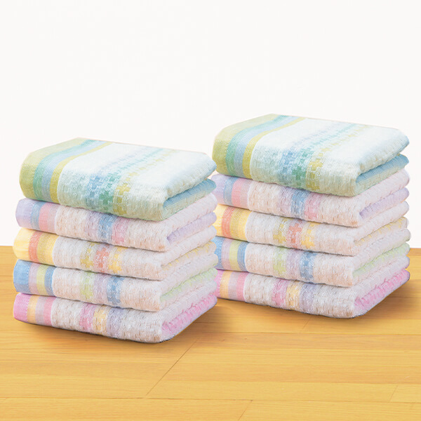 普段使いに活躍!今治産タオルセット! 日本が誇るタオルの産地今治 選べる2セット 【フェイスタオル10枚組】 ・グリーン×2 ・パープル×2 ・イエロー×2 ・ブルー×2 ・ピンク×2 【バスタオル4枚組】 ・グリーン×1 ・イエロー×1 ・ブルー×1 ・ピンク×1 ●凹凸感のある爽やかなストライプ柄