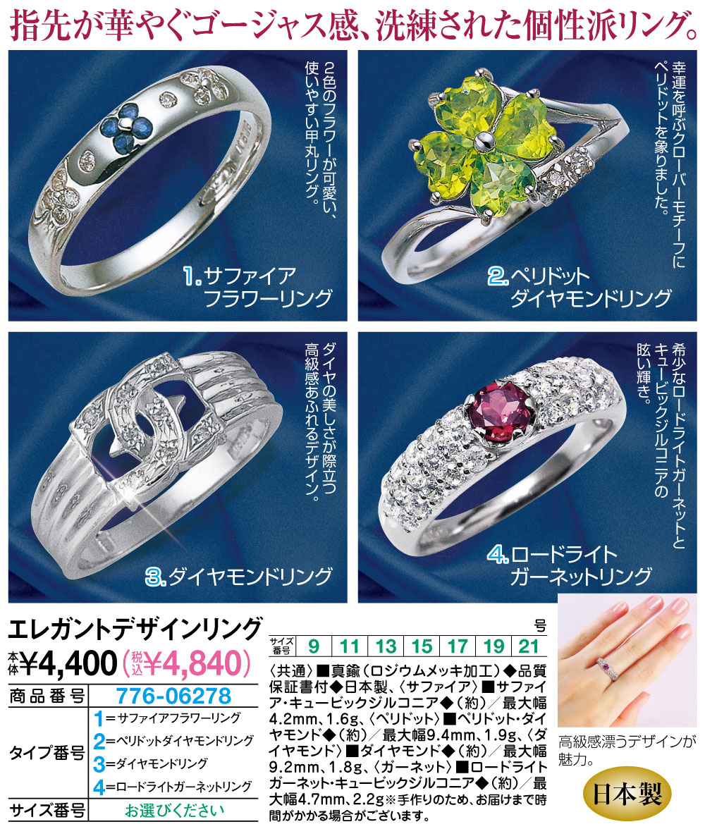 <共通> ■真鍮(プラチナカラー:ロジウムメッキ加工、18金カラー:18金メッキ加工) ◆品質保証書付 ◆日本製 <エメラルド> ■エメラルド・キュービックジルコニア ◆(約)/最大幅7.5mm、1.5g、 <ガーネット> ■ガーネット・ダイヤモンド ◆(約)/最大幅7.2mm、3.9g <シトリン> ■シトリン・ダイヤモンド ◆(約)/最大幅9mm、1.7g <サファイア> ■サファイア・キュービックジルコニア ◆(約)/最大幅4.2mm、1.6g
