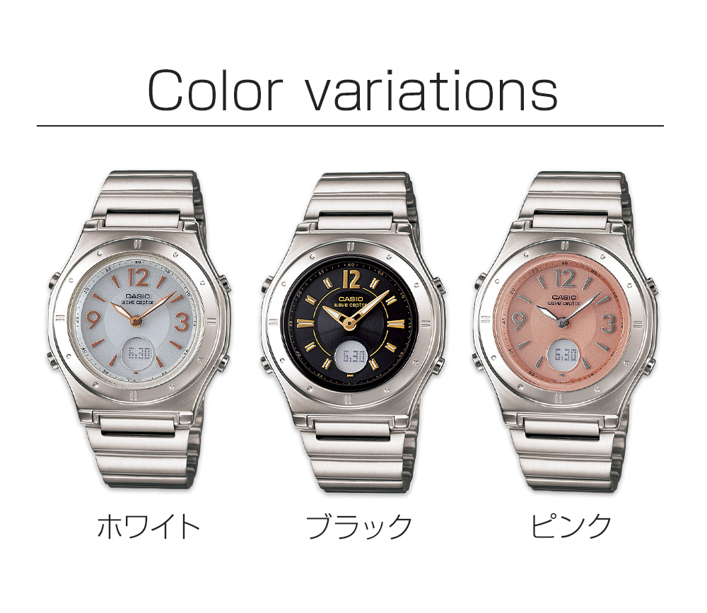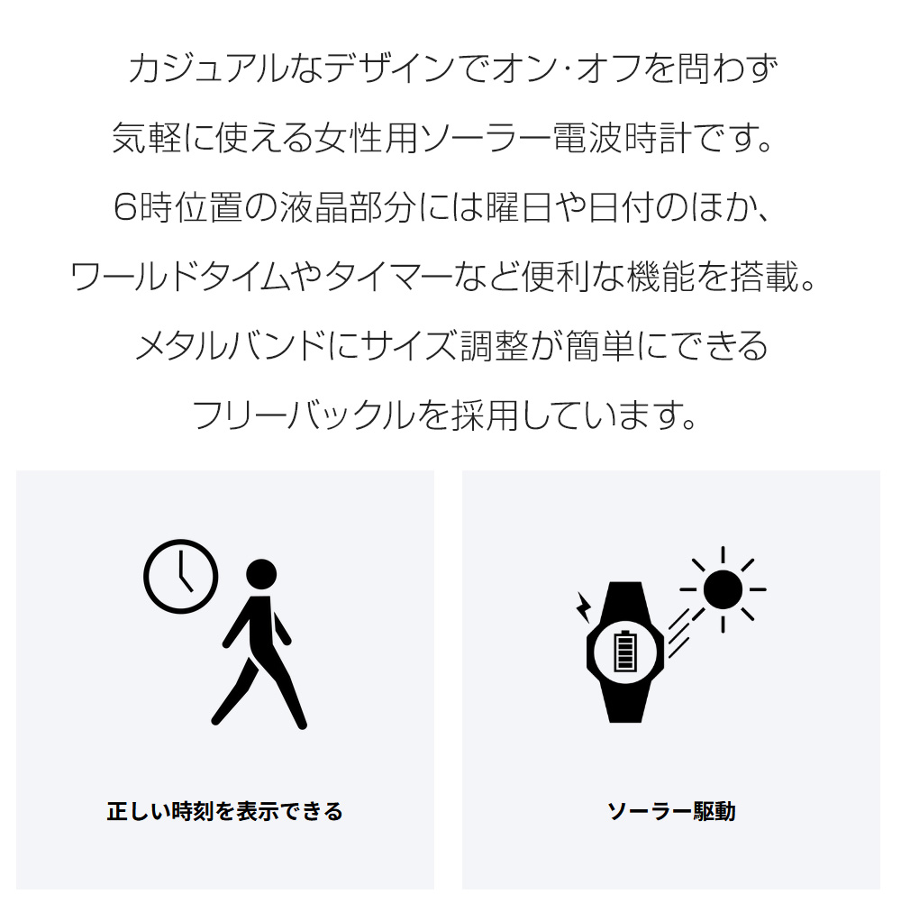 カジュアルなデザインでオン・オフを問わず気軽に使える女性用ソーラー電波時計です。