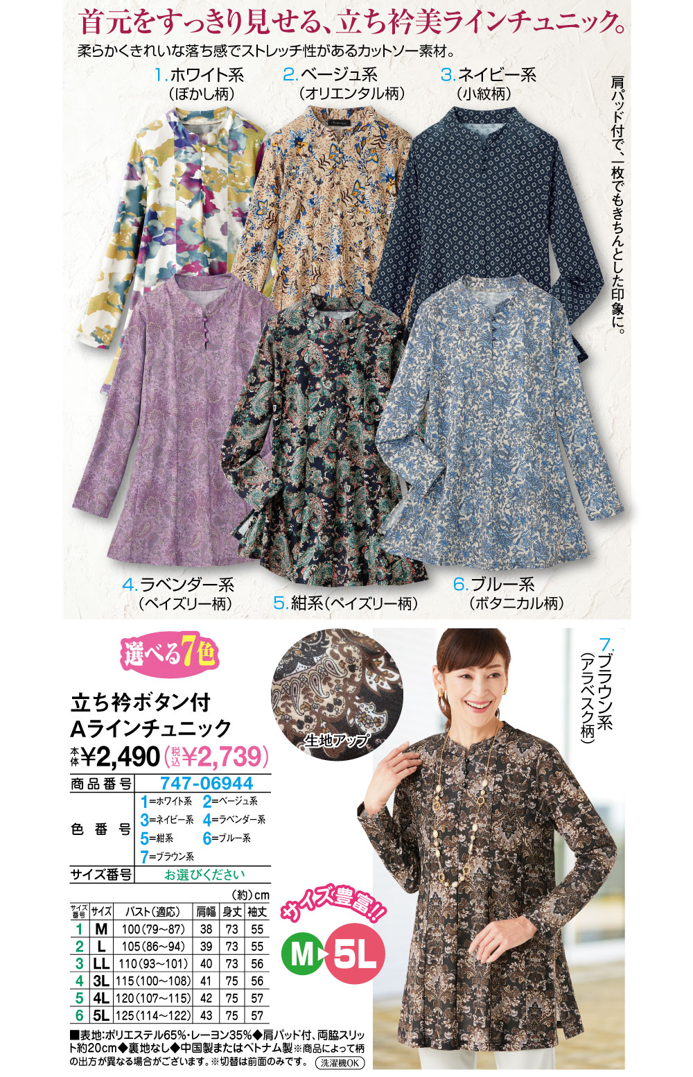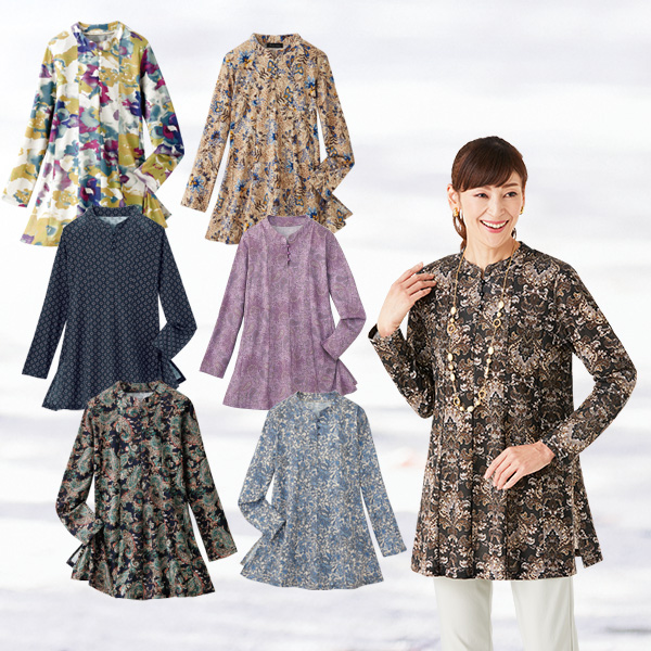 首元をさり気なくカバーする、立ち衿の美ラインチュニック! 柔らかくきれいな落ち感の、ストレッチ性があるカットソー素材。 前面は6枚はぎで女性らしいフレアーシルエット。 肩パッド付で、一枚でもきちんと見えます。 ●サイズ豊富!!
