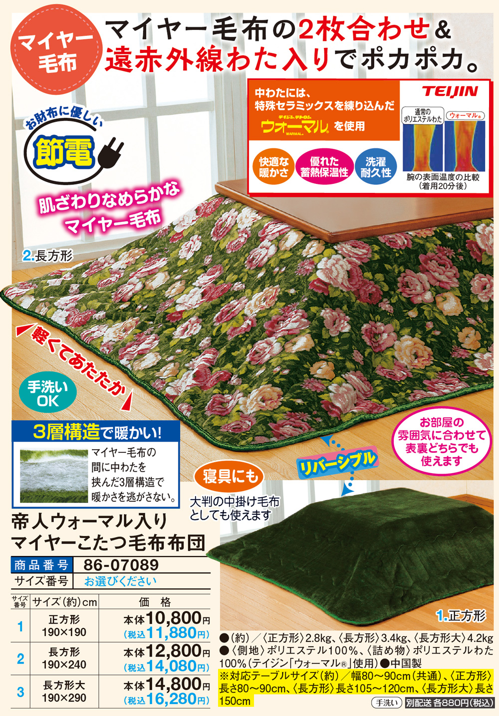 マイヤー毛布の2枚合わせ&遠赤外線わた入りでポカポカ! 冬の支度を始めよう♪ ぬくぬくこたつ 肌ざわりなめらかなマイヤー毛布。 軽くてあたたか。 【3層構造で暖かい!】 マイヤー毛布の間に中わたを挟んだ3層構造で暖かさを逃がさない。 【中わたには、特殊セラミックスを練り込んだTEIJINウォーマル(R)を使用】 ●快適な暖かさ ●優れた蓄熱保温性 ●洗濯耐久性 【リバーシブル】 お部屋の雰囲気に合わせて表裏どちらでも使えます。 【寝具にも】 大判の中掛け毛布としても使えます。 ●お財布に優しい節電