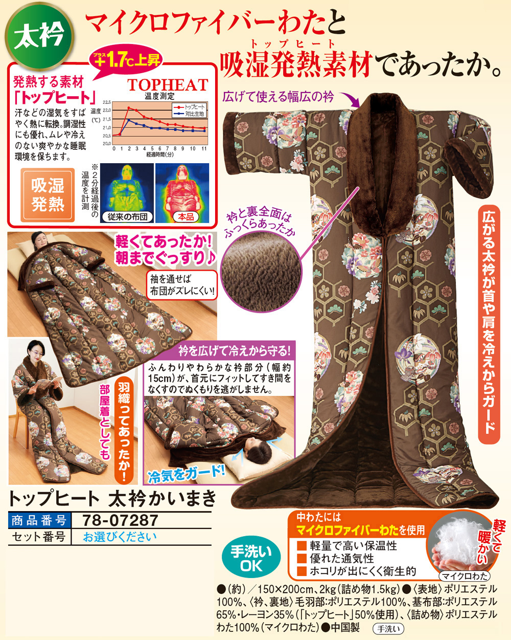 マイクロファイバーわたと吸湿発熱素材であったか! 【衿を広げて冷えから守る!】 ふんわりやわらかな衿部分(幅約15cm)が、首元にフィットしてすき間をなくすのでぬくもりを逃がしません。 ・袖を通せば布団がズレにくい! ・冷気をガード! 【発熱する素材「トップヒート」プラス1.7度上昇】 汗などの湿気をすばやく熱に転換。 調湿性にも優れ、ムレや冷えのない爽やかな睡眠環境を保ちます。 ●吸湿発熱 【中わたにはマイクロファイバーわたを使用】 軽くて暖かいマイクロわた ・軽量で高い保温性 ・優れた通気性 ・ホコリが出にくく衛生的 衿と裏全面はふっくらあったか 広げて使える幅広の衿 広がる太衿が首や肩を冷えからガード 部屋着としても ●太衿