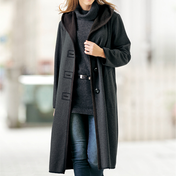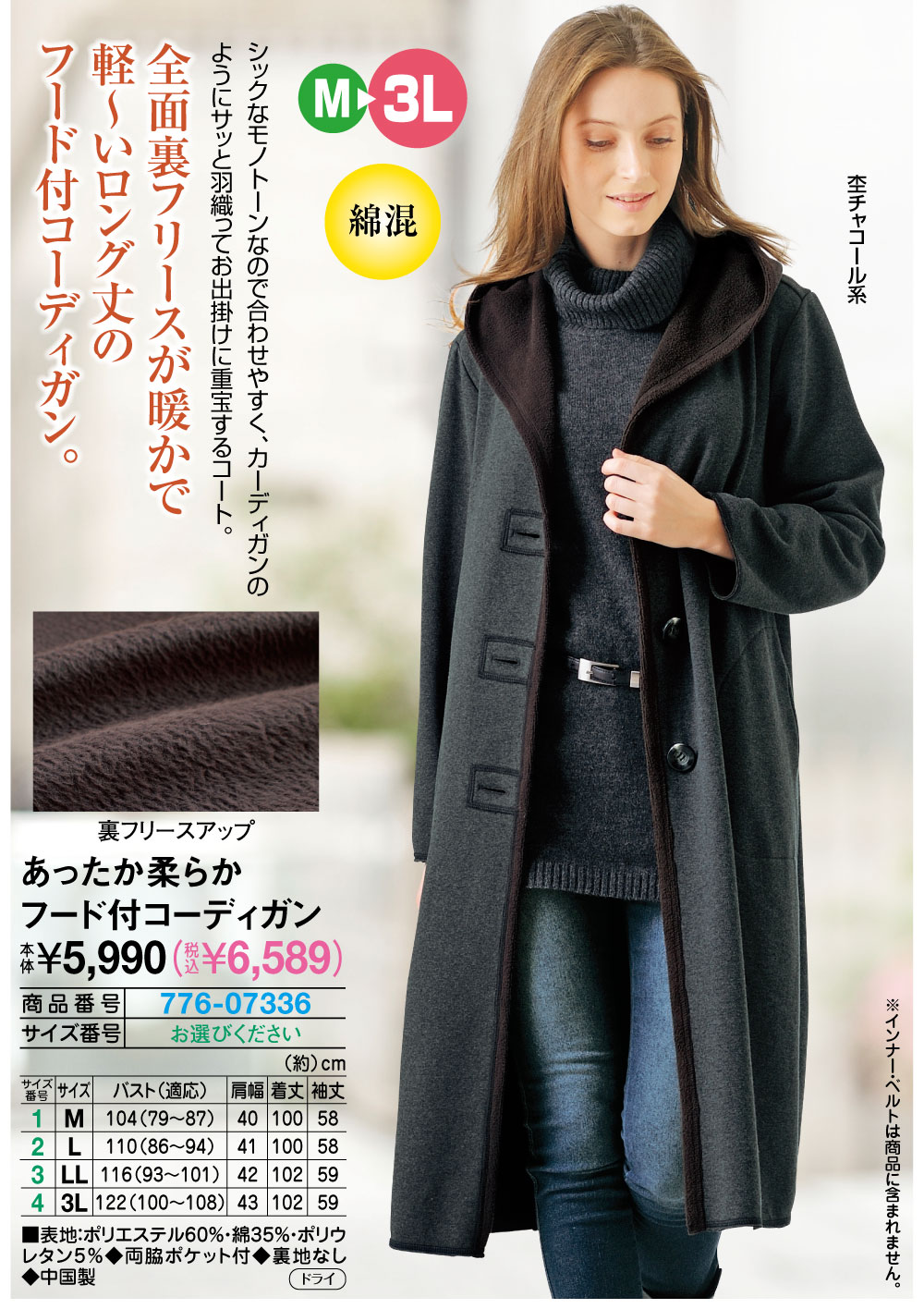 全面裏ファーが暖かで軽~いロング丈のフード付コーディガン! シックなモノトーンなので合わせやすく、カーディガンのようにサッと羽織ってお出掛けに重宝するコート。 ●M~3L ●綿混