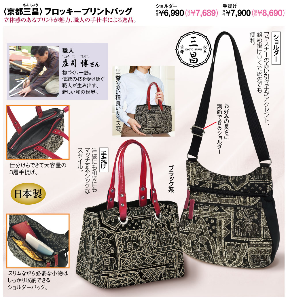 立体感のあるプリントが魅力、職人の手仕事による逸品! 【ショルダー】 ●ファスナーの赤い引き手がアクセント、斜め掛けOKで旅先でも便利。 ●お好みの長さに調節できるショルダー ●ポケットも多く使い勝手抜群。 【職人庄司博さん】 物づくり一筋。伝統の技を受け継ぐ職人が生み出す、新しい和の世界。