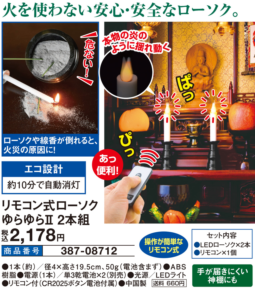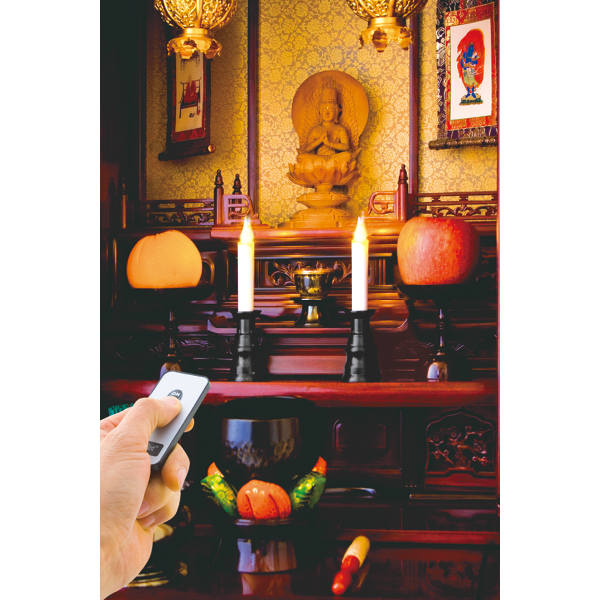 火を使わない安心・安全なローソク! 危ない!ローソクや線香が倒れると、火災の原因に! 本物の炎のように揺れ動く エコ設計:約10分で自動消灯 手が届きにくい神棚にも 操作が簡単なリモコン式 【セット内容】 ・LEDろうそく×2本 ・リモコン×1個