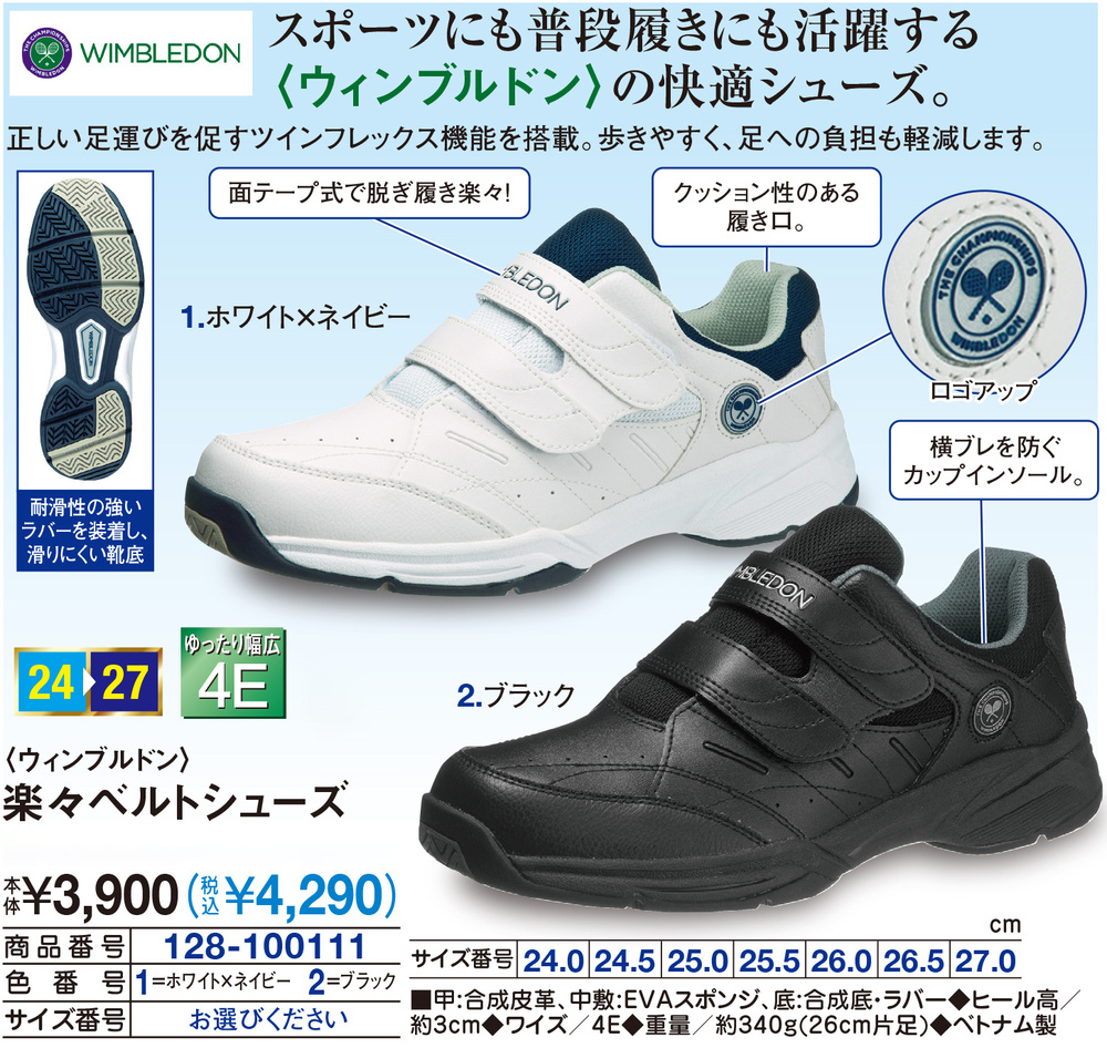 スポーツにも普段履きにも活躍するウィンブルドンの快適シューズ! 正しい足運びを促すツインフレックス機能を搭載。歩きやすく、足への負担も軽減します。 面テープ式で脱ぎ履き楽々! クッション性のある履き口。 横ブレを防ぐカップインソール。 耐滑性の強いラバーを装着し、滑りにくい靴底 ●ゆったり幅広4E