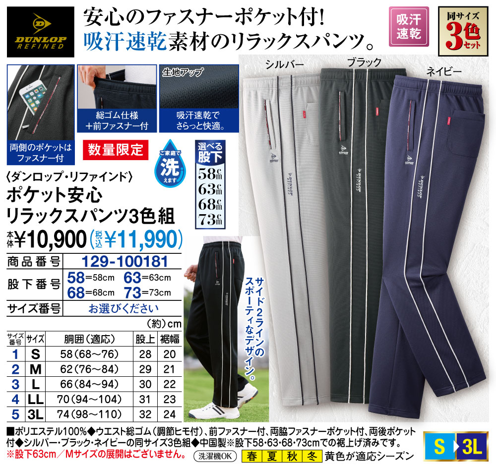 【サイズ(約)】 胴囲(適応)、股上、裾幅 <S>58(68~76)cm、28cm、20cm <M>62(76~84)cm、29cm、21cm <L>66(84~94)cm、30cm、22cm <LL>70(94~104)cm、31cm、23cm <3L>74(98~110)cm、32cm、24cm ■ポリエステル100% ◆ウエスト総ゴム、前ファスナー付、両脇ファスナーポケット付、両後ポケット付 ◆シルバー・ブラック・ネイビーの同サイズ3色組 ◆中国製