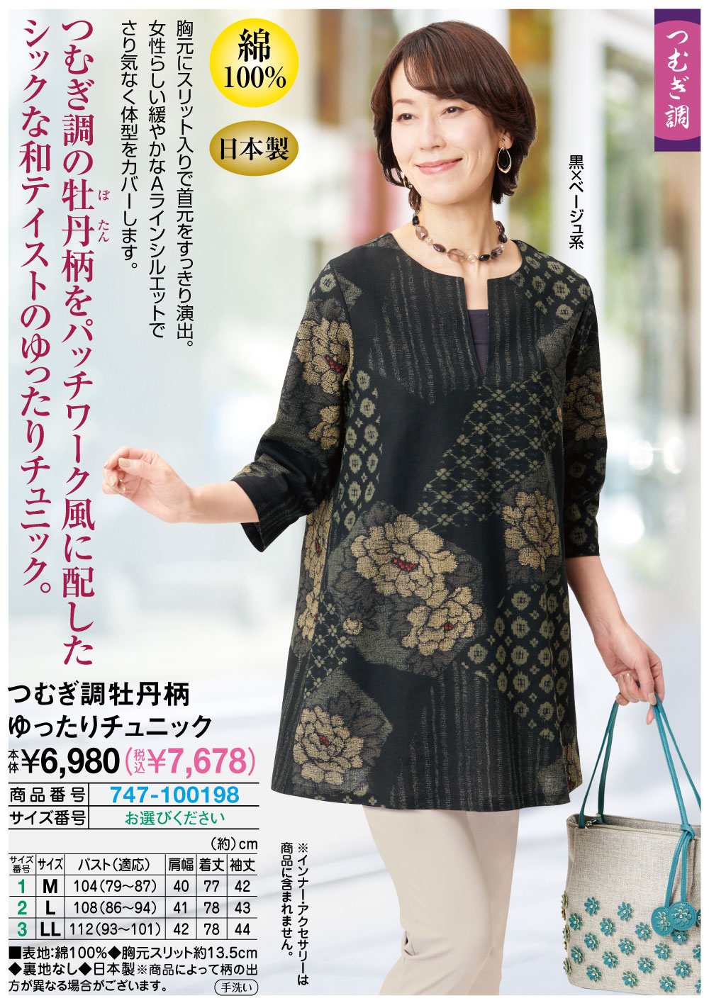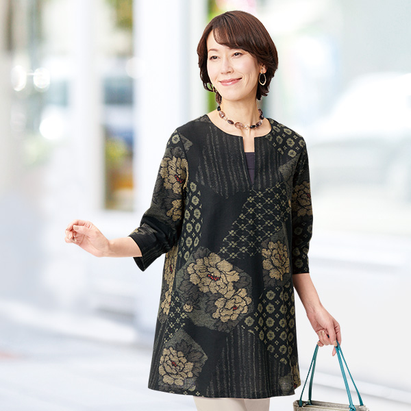 つむぎ調の牡丹柄をパッチワーク風に配したシックな和テイストのゆったりチュニック! 胸元にスリット入りで首元をすっきり演出。女性らしい緩やかなAラインシルエットでさり気なく体型をカバーします。 ●日本製 ●綿100%