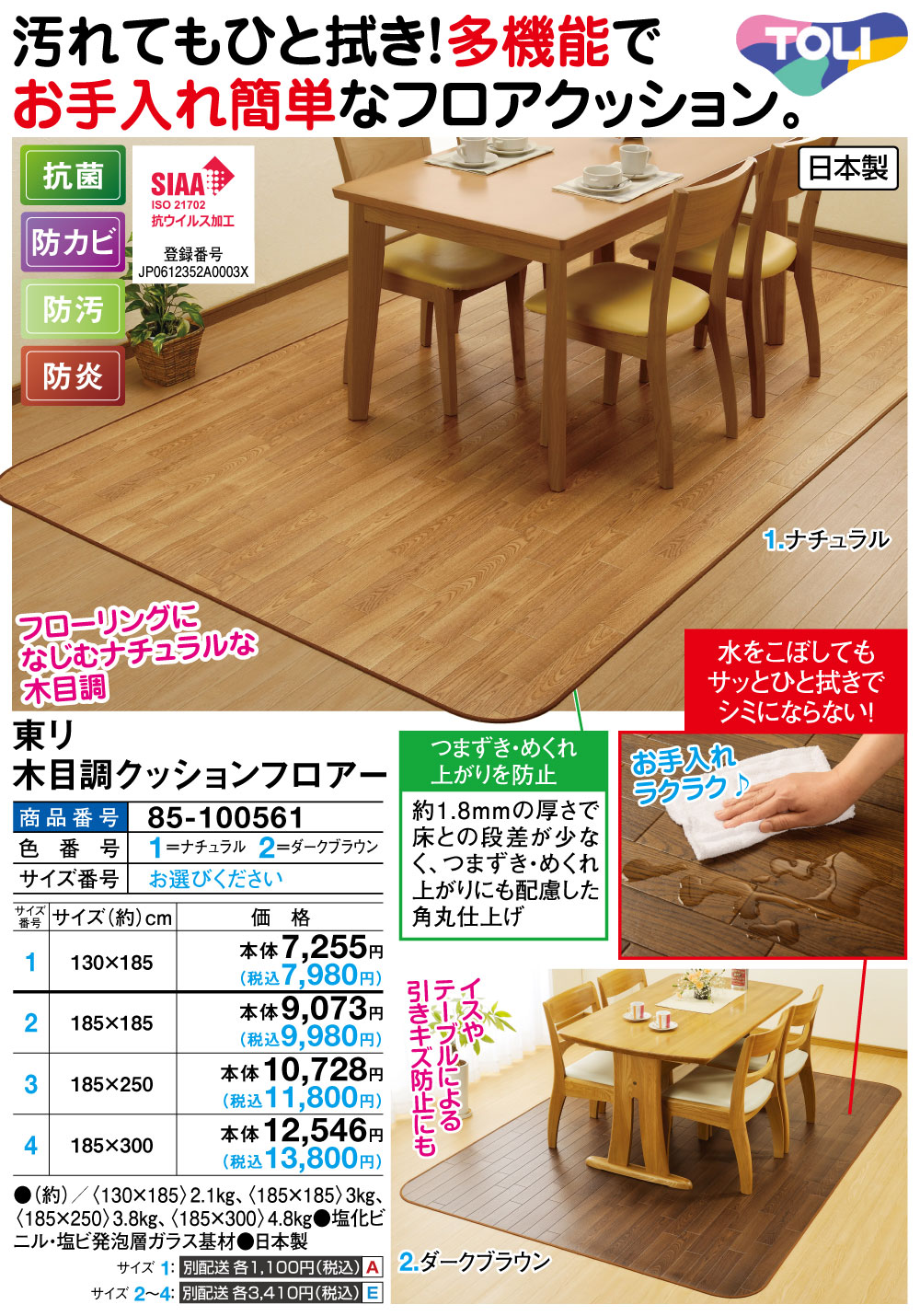 汚れてもひと拭き!多機能でお手入れ簡単なフロアクッション! フローリングになじむナチュラルな木目調 イスやテーブルによる引きキズ防止にも 水をこぼしてもサッとひと拭きでシミにならない! お手入れラクラク♪ 【つまずき・めくれ上がりを防止】 約1.8mmの厚さで床との段差が少なく、つまずき・めくれ上がりにも配慮した角丸仕上げ ●抗菌 ●防カビ ●防汚 ●防炎 ◆ISO 21702抗ウイルス加工:登録番号 JP061352A0003X
