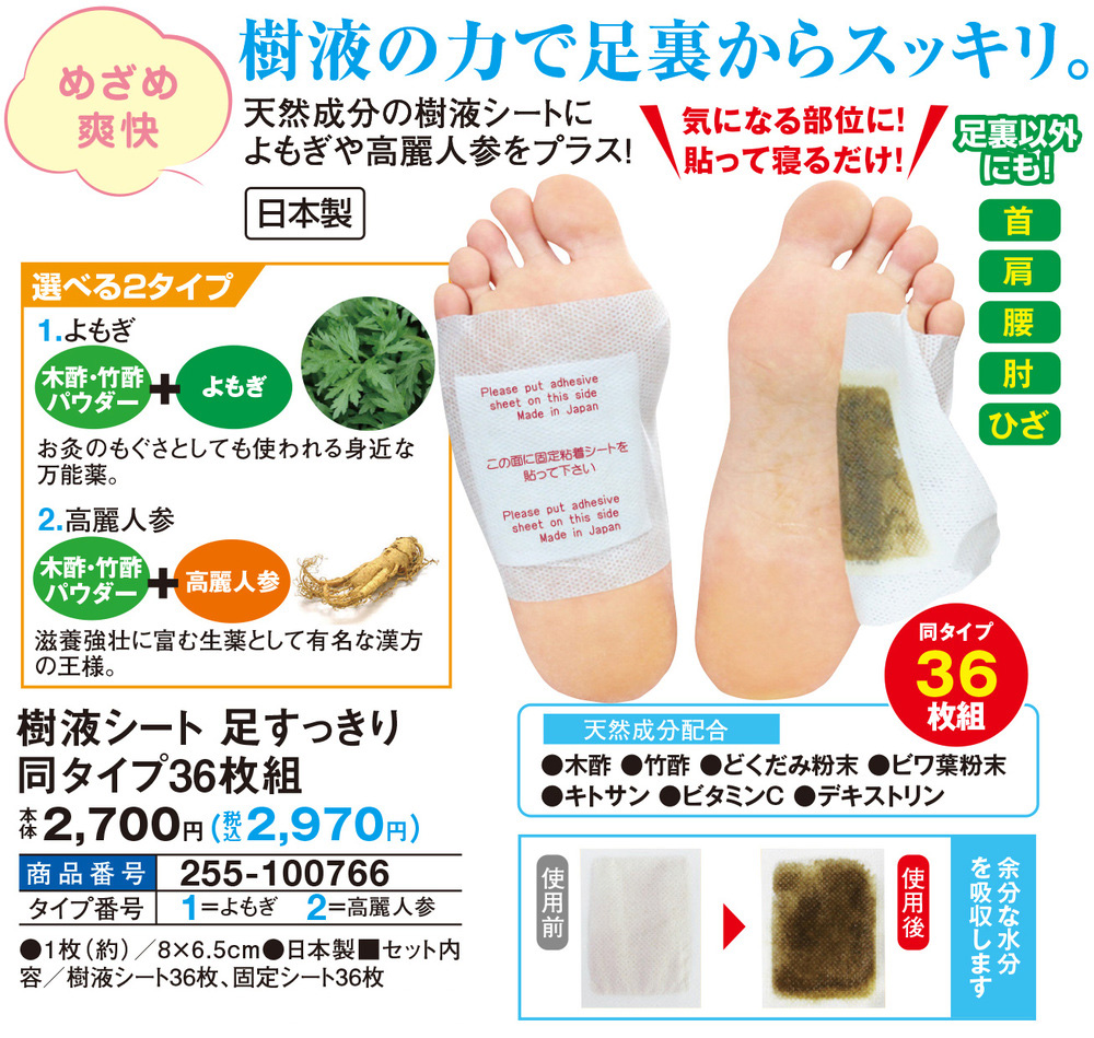 めざめ爽快!樹液の力で足裏からスッキリ! 天然成分の樹液シートによもぎや高麗人参をプラス! 気になる部位に!貼って寝るだけ! 【足裏以外にも!】 ●首 ●肩 ●腰 ●肘 ●ひざ 【選べる2タイプ】 1.よもぎ 木酢・竹酢パウダー+よもぎ お灸のもぐさとしても使われる身近な万能薬。 2.高麗人参 木酢・竹酢パウダー+高麗人参 滋養強壮に富む生薬として有名な漢方の王様。 【天然成分配合】 ●木酢 ●竹酢 ●どくだみ粉末 ●ビワ葉粉末 ●キトサン ●ビタミンC ●デキストリン 余分な水分を吸収します。
