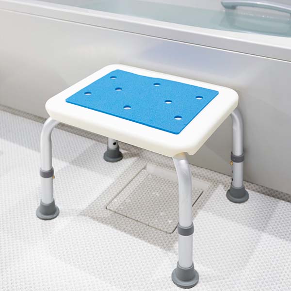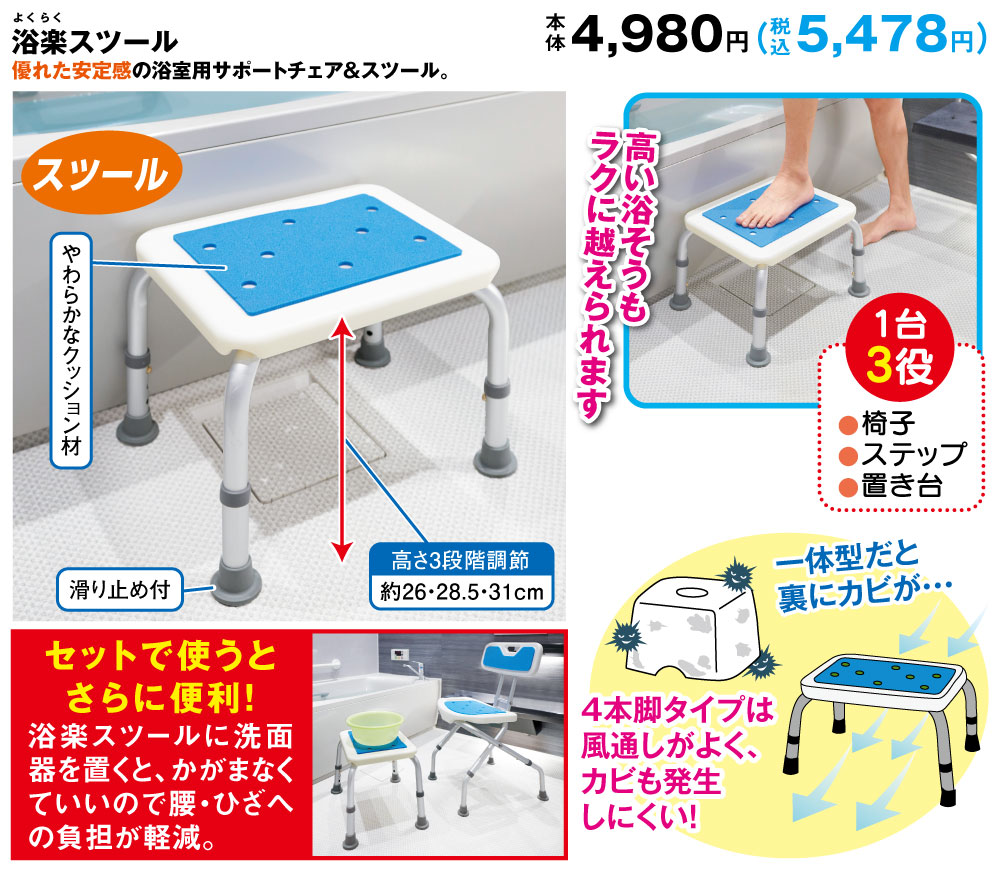 高さ調節ができて優れた安定感のサポートチェア! 人気の浴楽シリーズがリニューアル! 一体型だと裏にカビが・・・4本脚タイプは風通しがよく、カビも発生しにくい! 1台3役!高い浴そうも安心 高い浴そうもラクに越えられます 【1台3役】 ・椅子 ・ステップ ・置き台 【浴楽フォールディングチェアとセットで使うとさらに便利!】 浴楽スツールに洗面器を置くと、かがまなくていいので腰・ひざへの負担が軽減。 【高さ3段階調節】 約26・28.5・31cm ●やわらかなクッション材 ●滑り止め付