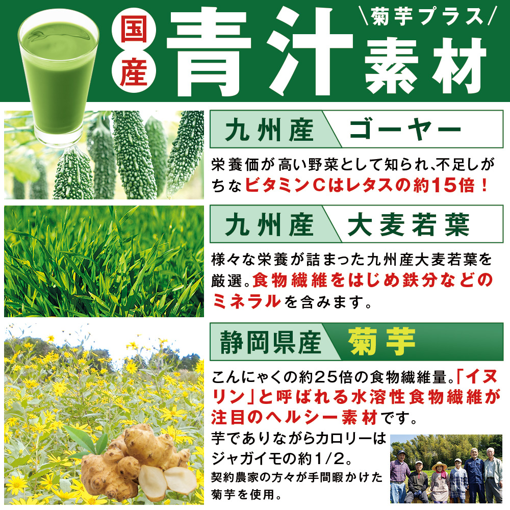 ①壊れにくいビタミンCが特徴の「ゴーヤー」 ②食物繊維や鉄の補給に「大麦若葉」をプラス ③こんにゃくの25倍以上※1の食物繊維「きくいも」※1:100g当り比較