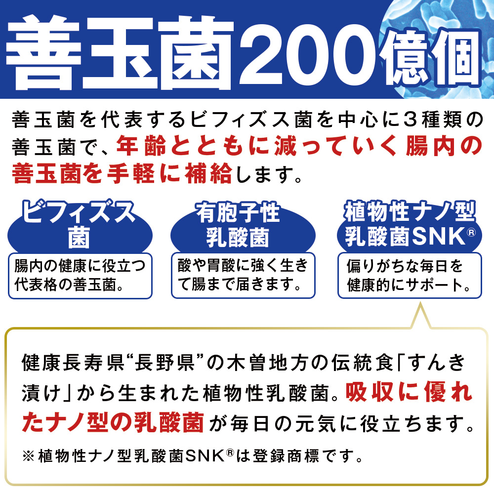 ①1日6粒に、善玉菌200億個! 健康や美容の維持、ダイエット時の栄養補給に欠かせない「善玉菌」 ⇒体内で力を発揮する「乳酸菌2種類」と年齢とともに減っていく「ビフィズス菌」、合計3種類を厳選。 腸内の善玉菌が少なくなり、悪玉菌が有意になると、さまざまな不調が起こります。 ②吸収率が約5倍のヘム鉄「乾燥プルーン約25個分」 ※2:非ヘム鉄との比較(ヘム鉄は、レバーと同じ種類の鉄分) ⇒実は、大人も子供も鉄分が不足気味。最近は、運動による鉄分不足も注意がされています。 ③ビタミンCは、1日6粒でレモン(果汁)約2.5個分