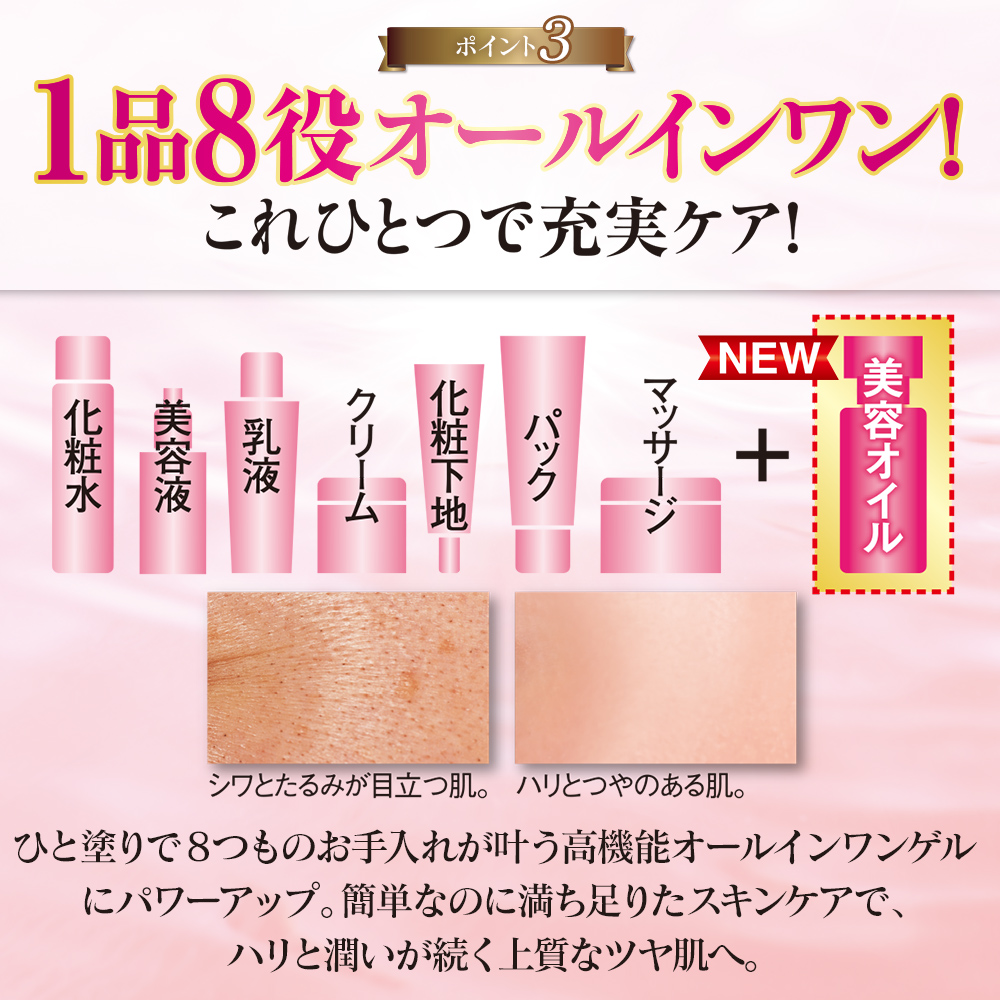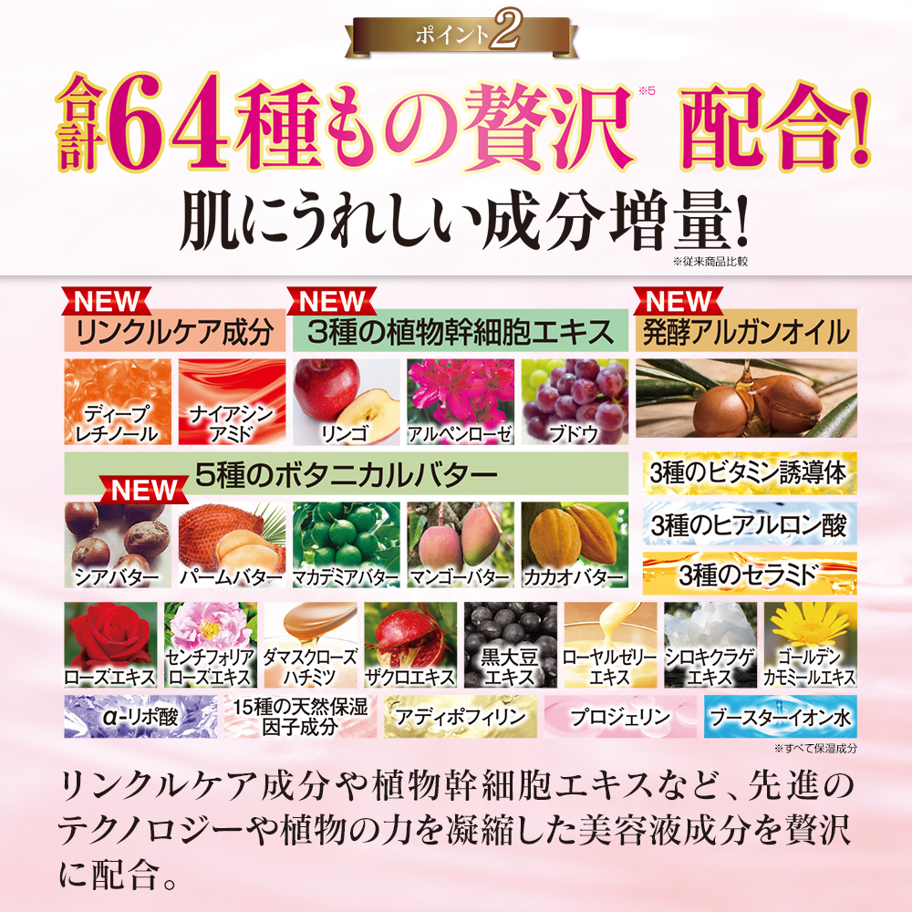 【内容量】1個:100g(約1.5ヵ月分) 【主な配合成分】10種のコラーゲン、7種の速攻リフト成分、ディープレチノール、ナイアシンアミド、3種の植物幹細胞エキス、発酵アルガンオイル、5種のボタニカルバター、3種のビタミン誘導体、3種のヒアルロン酸、3種のセラミド、ローズエキス、センチフォリアローズエキス、ダマスクローズハチミツ、ザクロエキス、黒大豆エキス、ローヤルゼリーエキス、シロキクラゲエキス、ゴールデンカモミールエキス、α-リポ酸、15種の天然保湿因子成分、アディポフィリン、プロジェリン、ブースターイオン水