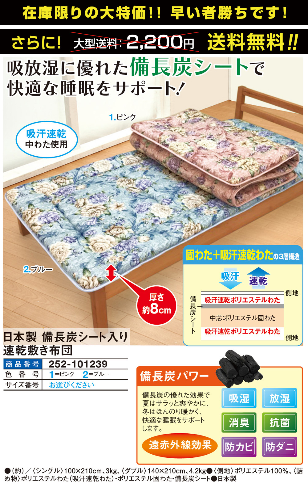 ●(約)/<シングル>100×210cm、3kg、<ダブル>140×210cm、4.2kg ●<側地>ポリエステル100%、<詰め物>ポリエステルわた(吸汗速乾わた)・ポリエステル固わた・備長炭シート ●日本製