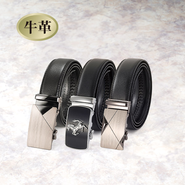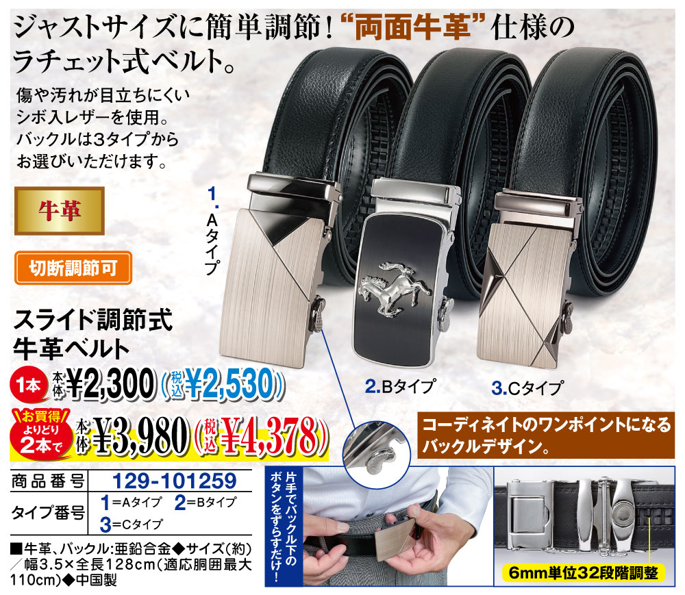 ジャストサイズに簡単調節!両面牛革使用のラチェット式ベルト! 傷や汚れが目立ちにくいシボ入レザーを使用。 バックルは3タイプからお選びいただけます。 片手でバックル下のボタンをずらすだけ! 6mm単位32段階調節 ●切断調節可 ●牛革