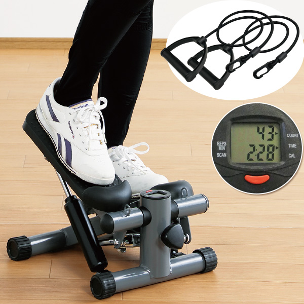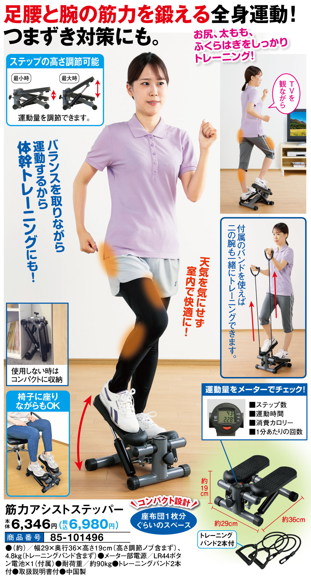 踏み込むだけの簡単エクササイズ!ステップ運動で足腰の筋力アップ TVを観ながら楽しく運動。 お尻、太もも、ふくらはぎをしっかりトレーニング! 付属のバンドを使えば二の腕も一緒にトレーニングできます。 【運動量をメーターでチェック!】 ・ステップ数・運動時間・消費カロリー・1分あたりの回数 【踏み込み幅調節可能】 ステップの高さを調節することで運動量を調節できます。 コンパクト設計!座布団1枚分ぐらいのスペース