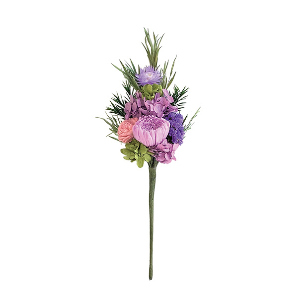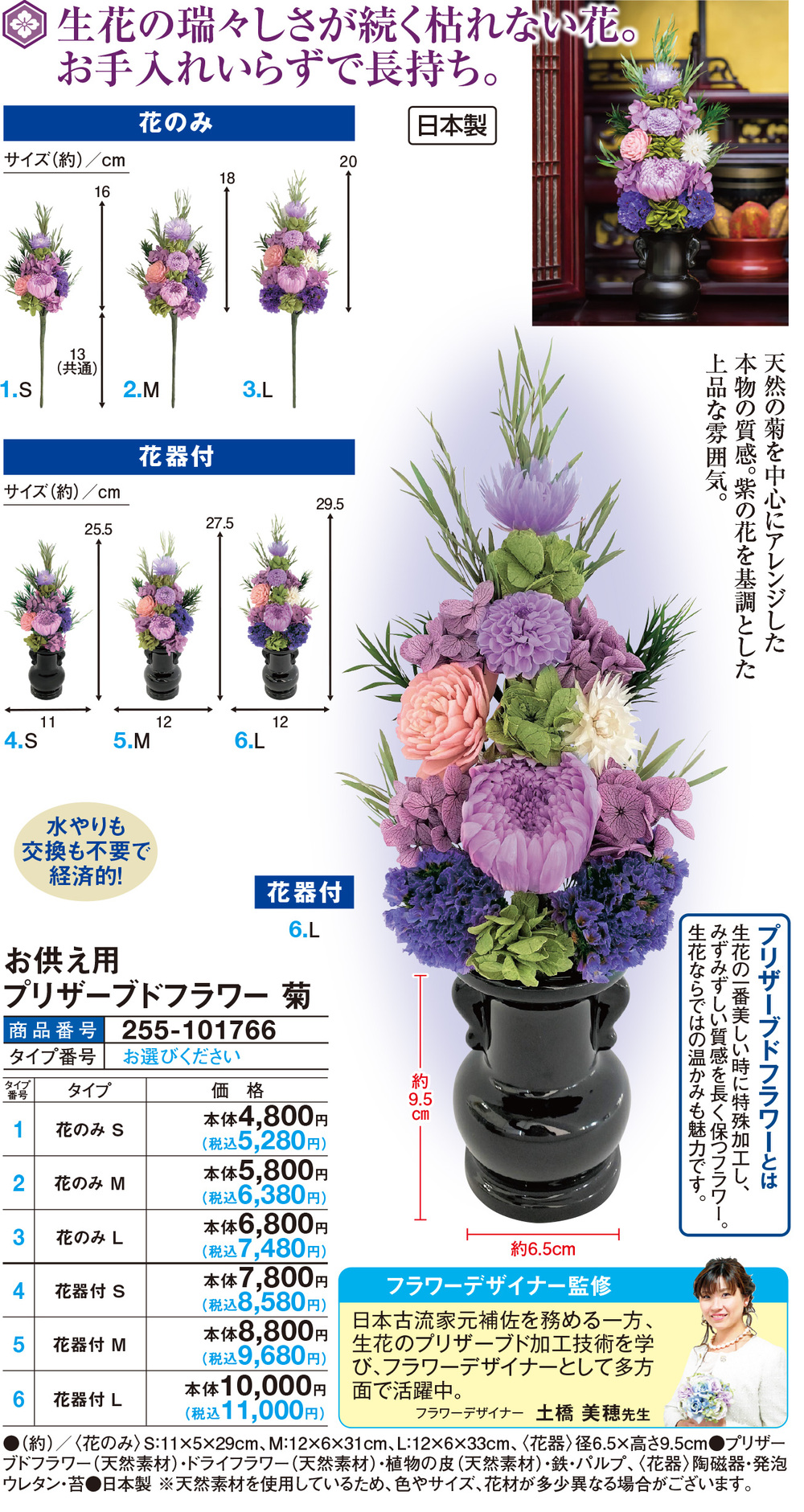 生花の瑞々しさが続く枯れない花、お手入れいらずで長持ち! 天然の菊を中心にアレンジした本物の質感。 紫の花を基調とした上品な雰囲気。 【プリザーブドフラワーとは】 生花の一番美しい時に特殊加工し、みずみずしい質感を長く保つフラワー。 生花ならではの温かみも魅力です。 ●水やりも交換も不要で経済的! 【フラワーデザイナー監修】 日本古流家元補佐を務める一方、生花のプリザーブド加工技術を学び、フラワーデザイナーとして多方面で活躍中。 フラワーデザイナー 土橋 美穂先生