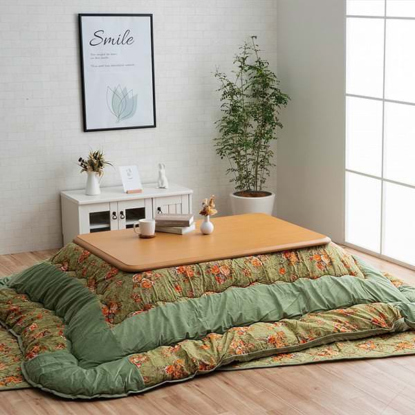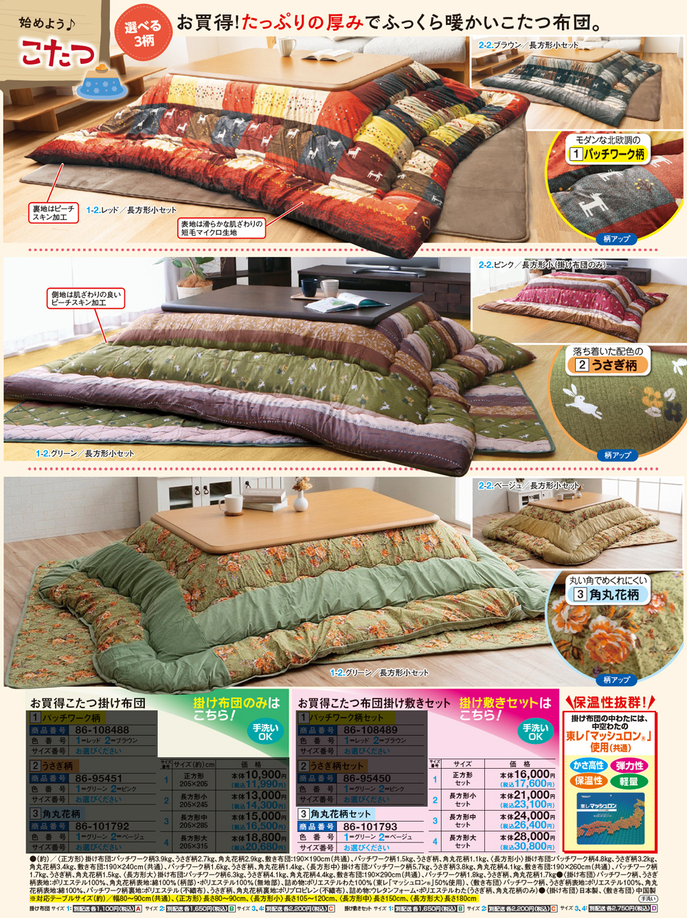 お買得!たっぷりの厚みでふっくら暖かいこたつ布団! 冬の支度を始めよう♪ ぬくぬくこたつ 丸い角でめくれにくい角丸花柄 表地は滑らかな肌ざわりの短毛マイクロ生地 裏地はピーチスキン加工 側地は肌ざわりの良いピーチスキン加工 \保温性抜群!/ 掛け布団の中わたには、中空わたの東レ「マッシュロン(R)」使用(共通) ●かさ高性 ●弾力性 ●保温性 ●軽量