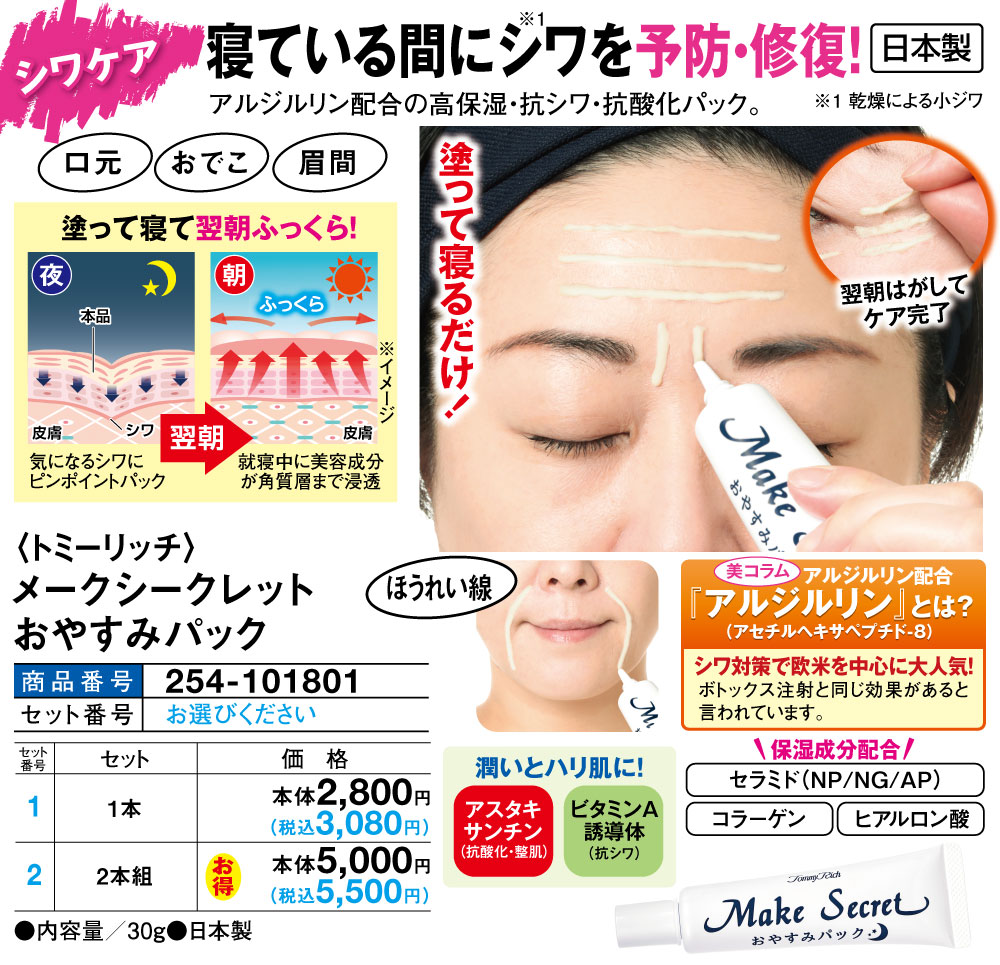 寝ている間にシワ(※1)を予防・修復! 塗って寝るだけ!翌朝はがしてケア完了! アルジルリン配合の高保湿・抗シワ・抗酸化パック。 【塗って寝て翌朝ふっくら!】 ●気になるシワにピンポイントパック ●就寝中に美容成分が角質層まで浸透 ●口元 ●おでこ ●眉間 ●ほうれい線 【『アルジルリン』とは?(アセチルヘキサペプチド-8)】 シワ対策で欧米を中心に大人気! ボトックス注射と同じ効果があると言われています。 【潤いとハリ肌に!】 ●アスタキサンチン(抗酸化・整肌) ●ビタミンA誘導体(抗シワ) 【保湿成分配合】 ●セラミド(NP/NG/AP) ●コラーゲン ●ヒアルロン酸