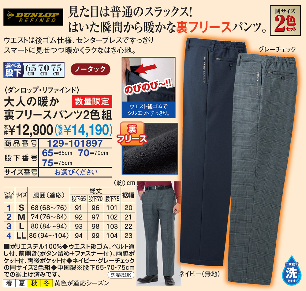 見た目は普通のスラックス!はいた瞬間から暖かな裏フリースパンツ! ウエストは後ゴム仕様、センタープレスですっきりスマートに見せつつ暖かくラクなはき心地。 ウエスト後ゴムでシルエットすっきり。 ●裏フリース ●ノータック ●同サイズ2色セット ●選べる股下65cm・70cm・75cm