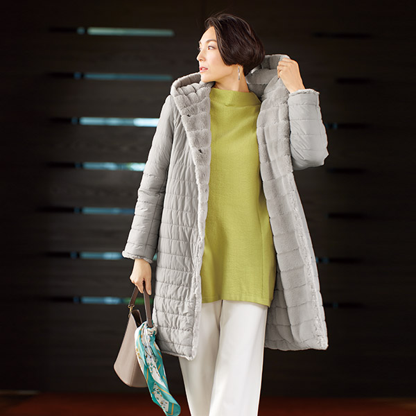中わた入りのボーダーキルトと、肌触りの良いボーダー状のエコファーのリバーシブル仕様。