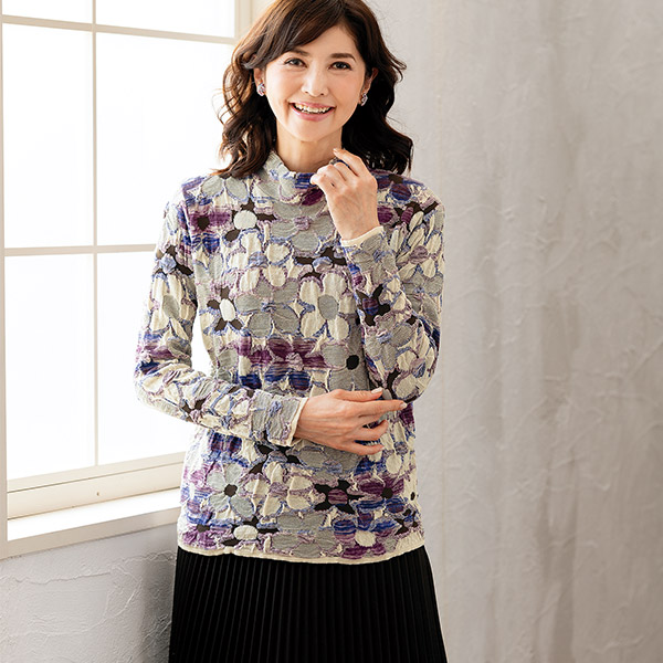 かすり糸で花柄をあしらったウール混のセーター! 編み地変化で花柄の凹凸感を引き出した繊細で優雅な一着。 柔らかい肌触りで、着心地も快適です。 ●ウール混