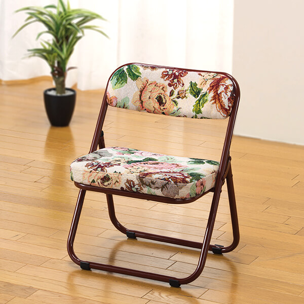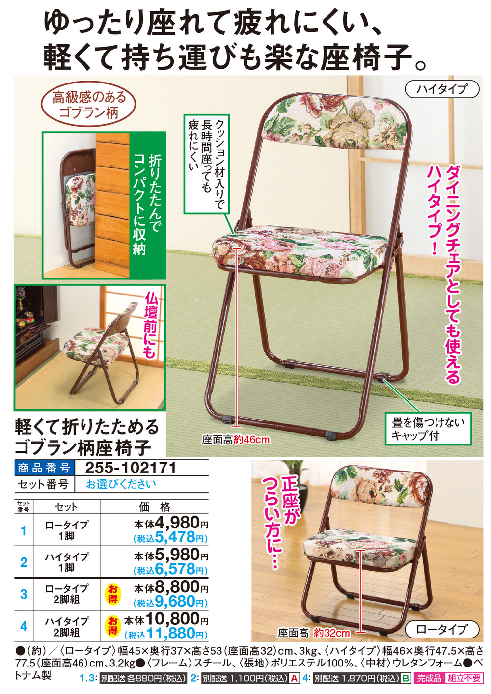 ゆったり座れて疲れにくい、軽くて持ち運びも楽な座椅子! クッション材入りで長時間座っても疲れにくい 畳を傷つけないキャップ付 折りたたんでコンパクトに収納 仏壇前にも ●ダイニングチェアとしても使えるハイタイプ! 座面高約46cm ●正座がつらい方に…ロータイプ 座面高 約32cm ●高級感のあるゴブラン柄