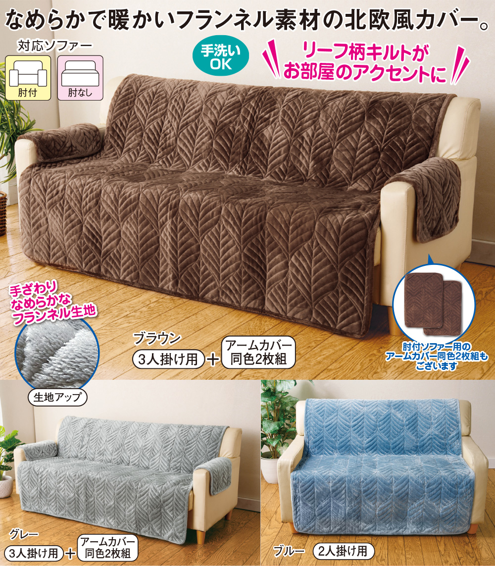 なめらかで暖かいフランネル素材の北欧風カバー! 対応ソファー:肘付/肘なし リーフ柄キルトがお部屋のアクセントに 手ざわりなめらかなフランネル生地 肘付ソファー用のアームカバー同色2枚組もございます