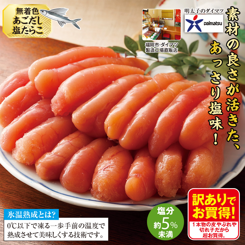 良質なロシア産のすけとうだらの卵を、活性炭で浄水した仕込み水で塩漬けにしました。 氷温熟成を施したさっぱり味の塩たらこです。 訳ありでお買得! 1本物の皮やぶれや切れ子だから超お買得。 氷温熟成とは? 0℃以下で凍る一歩手前の温度で熟成させて美味しくする技術です。 無着色 あごだし塩たらこ