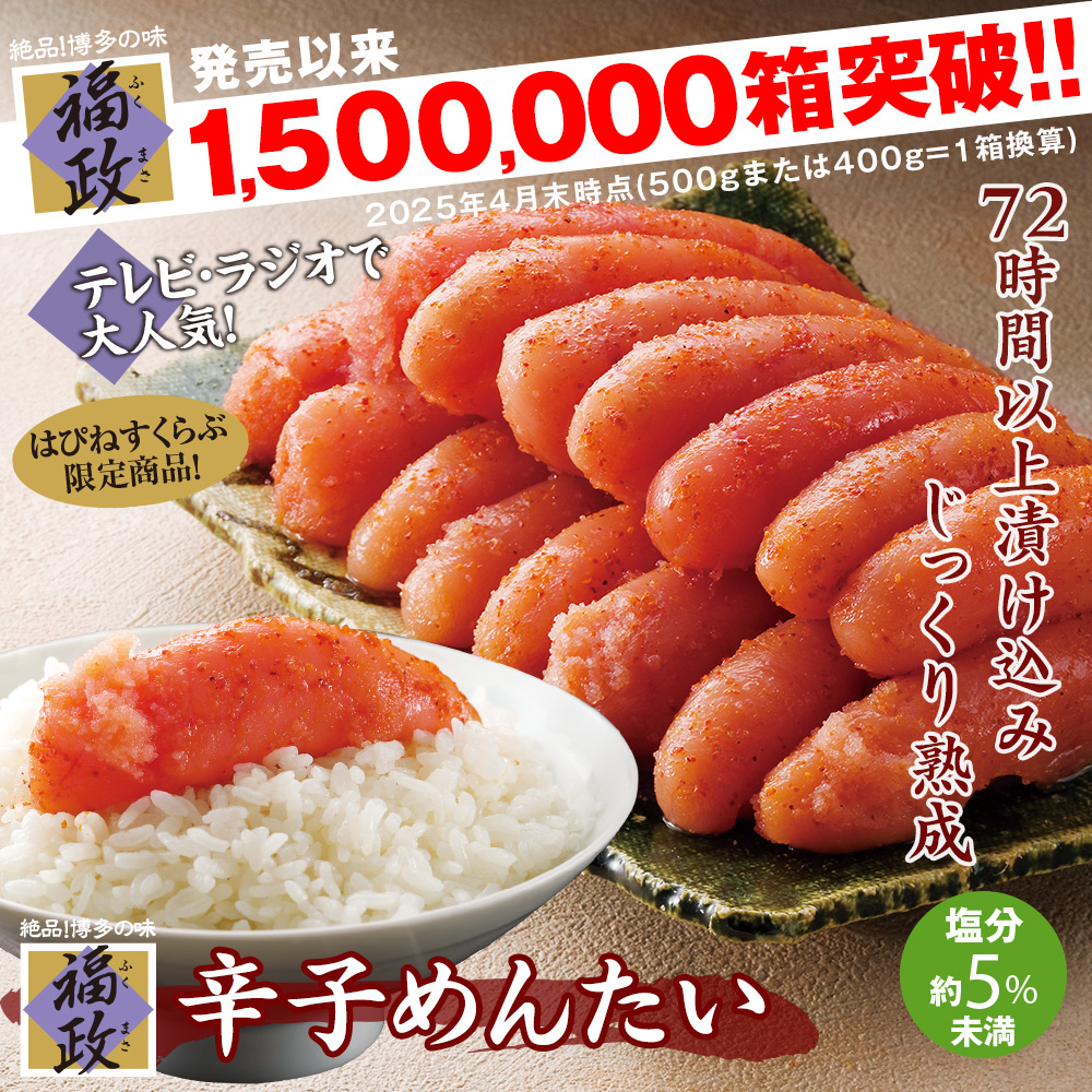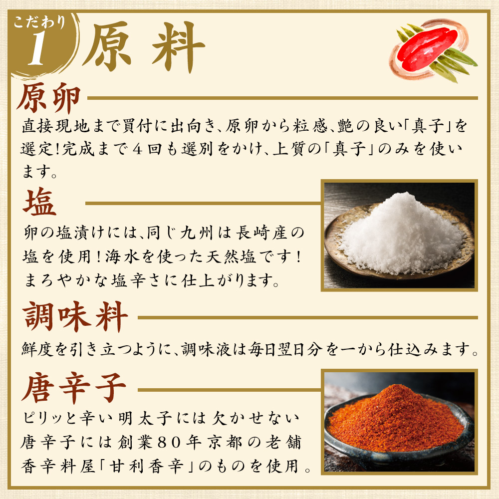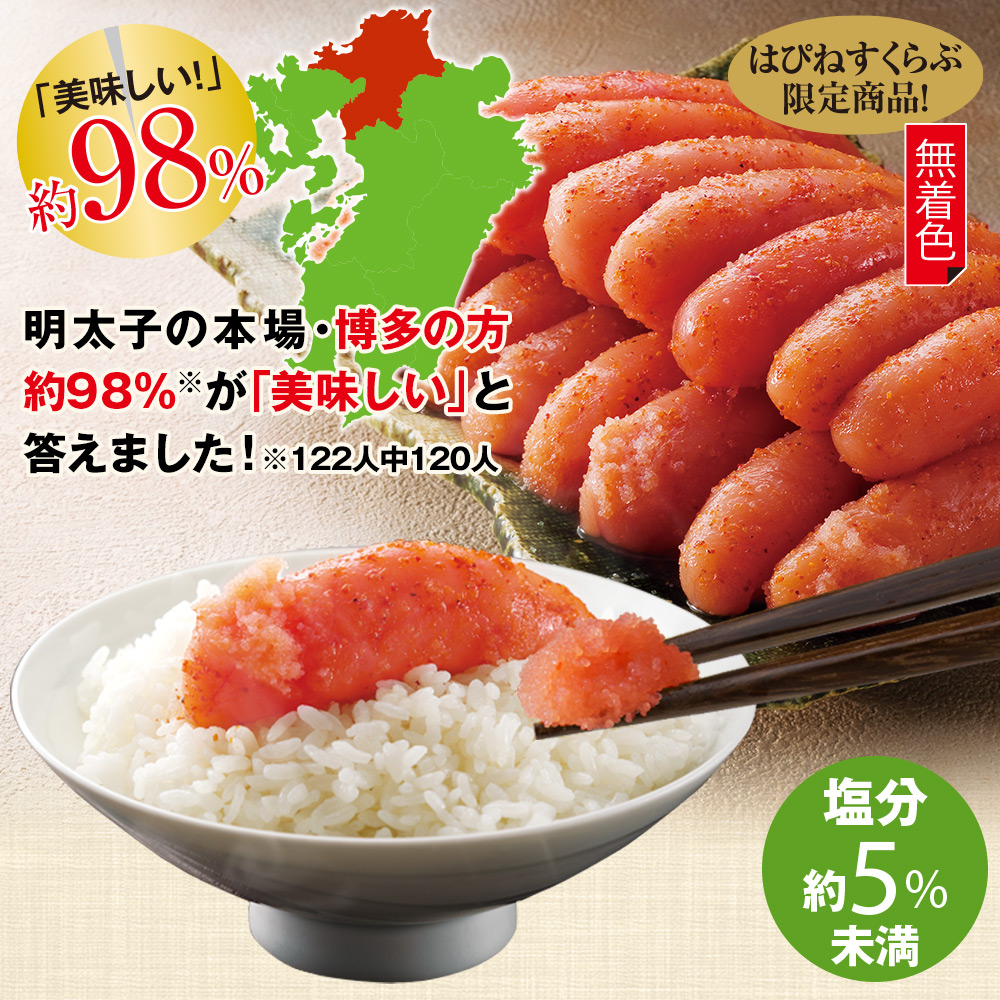 卵の旨味を最大限に引き出し、良質の辛子明太子が出来るまで、凍るか凍らないかの微妙な温度による氷温熟成でじっくり熟成させます。味付けは「はぴねすくらぶ」と和食の職人がこだわって作った秘伝の調味液を使用。卵の具合と外気温などに合わせ微妙に調整をして最大限の美味しさを引き出せるように作っています。辛さもひかえめで、まろやかな味付けになっていますので、お子様からご年配の方まで美味しく召し上がって頂けます。