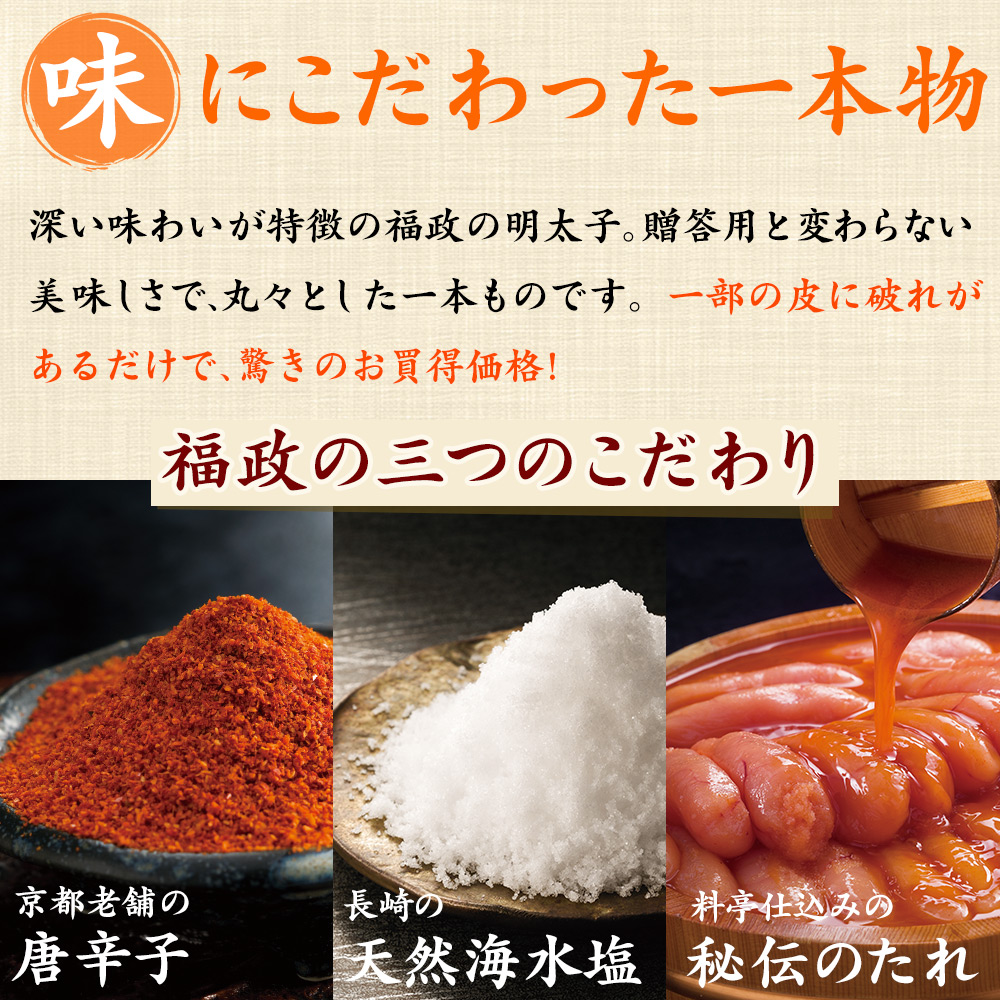 訳ありだからできた!思う存分召し上がれる、お得なボリュームセット!福政の美味しさを存分に召し上がって頂けるよう、お手頃な「やぶれ明太」をご用意しました!一本物の薄皮にちょっと切れが入ったり、破れたモノですが、姿形はほとんど一本物と同じ!味に関してもご贈答用と全く代わりない物をお届けします!