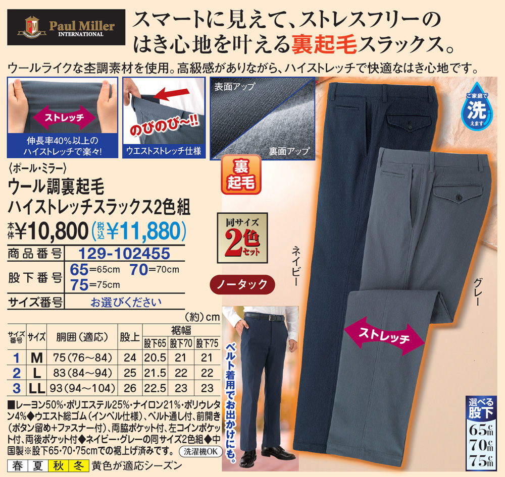 股下65cm【サイズ(約)】 胴囲(適応)、股上、裾幅 <M>75(76~84)cm、24cm、20.5cm <L>83(84~94)cm、25cm、21.5cm <LL>93(94~104)cm、26cm、22.5cm 股下70cm【サイズ(約)】 胴囲(適応)、股上、裾幅 <M>75(76~84)cm、24cm、21cm <L>83(84~94)cm、25cm、22cm <LL>93(94~104)cm、26cm、23cm 股下75cm【サイズ(約)】 胴囲(適応)、股上、裾幅 <M>75(76~84)cm、24cm、21cm <L>83(84~94)cm、25cm、22cm <LL>93(94~104)cm、26cm、23cm ■レーヨン50%・ポリエステル25%・ナイロン21%・ポリウレタン4% ◆ウエスト総ゴム(インベル仕様)、ベルト通し付、前開き(ボタン留め+ファスナー付)、両脇ポケット付、左コインポケット付、両後ポケット付 ◆ネイビー・グレーの同サイズ2色組 ◆中国製