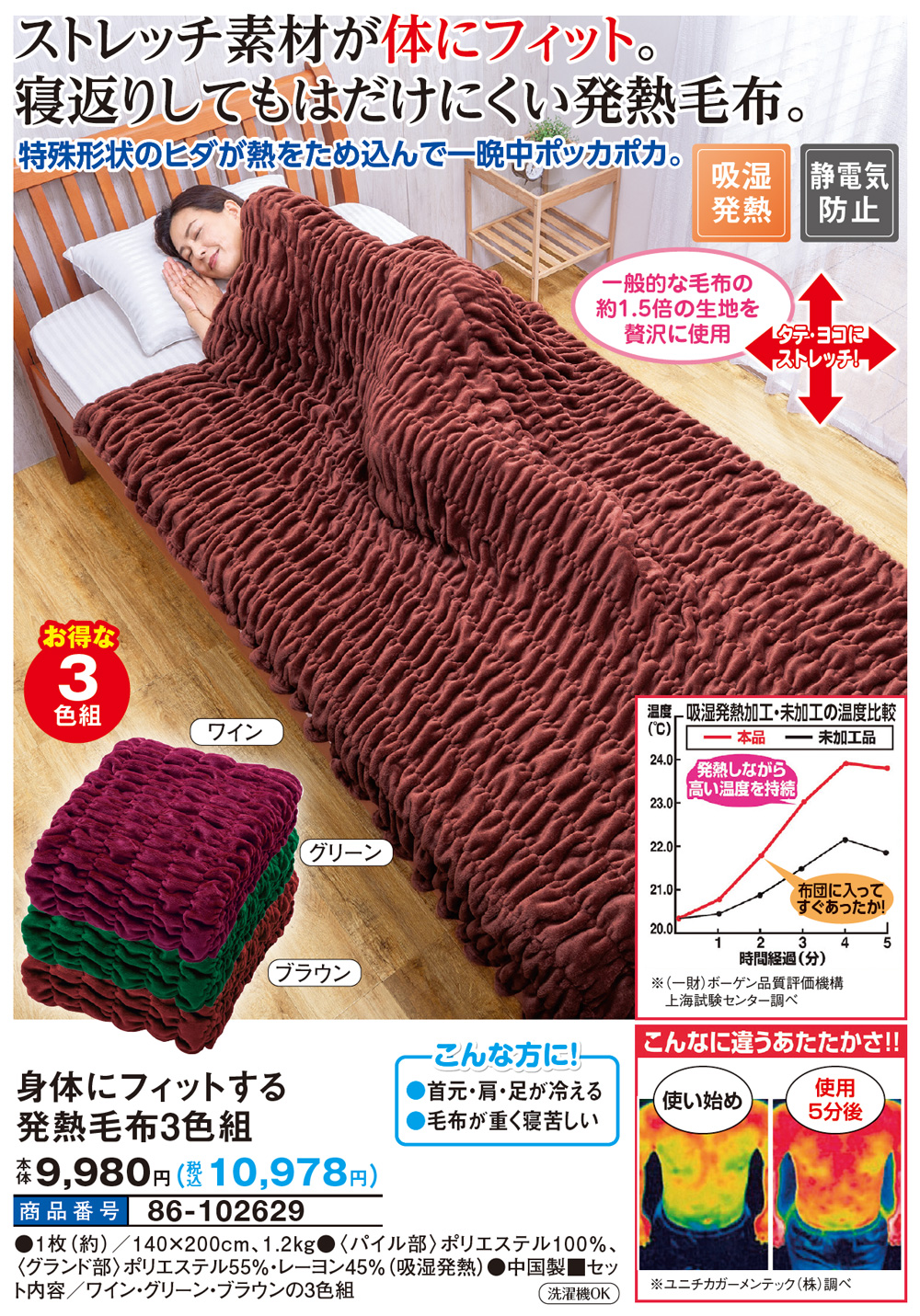 ストレッチ素材が体にフィット!寝返りしてもはだけにくい発熱毛布! 特殊形状のヒダが熱をため込んで一晩中ポッカポカ。 ●吸湿発熱 ●静電気防止 一般的な毛布の約1.5倍の生地を贅沢に使用 タテ・ヨコにストレッチ! お得な3色組 \こんな方に!/ ●首元・肩・足が冷える ●毛布が重く寝苦しい