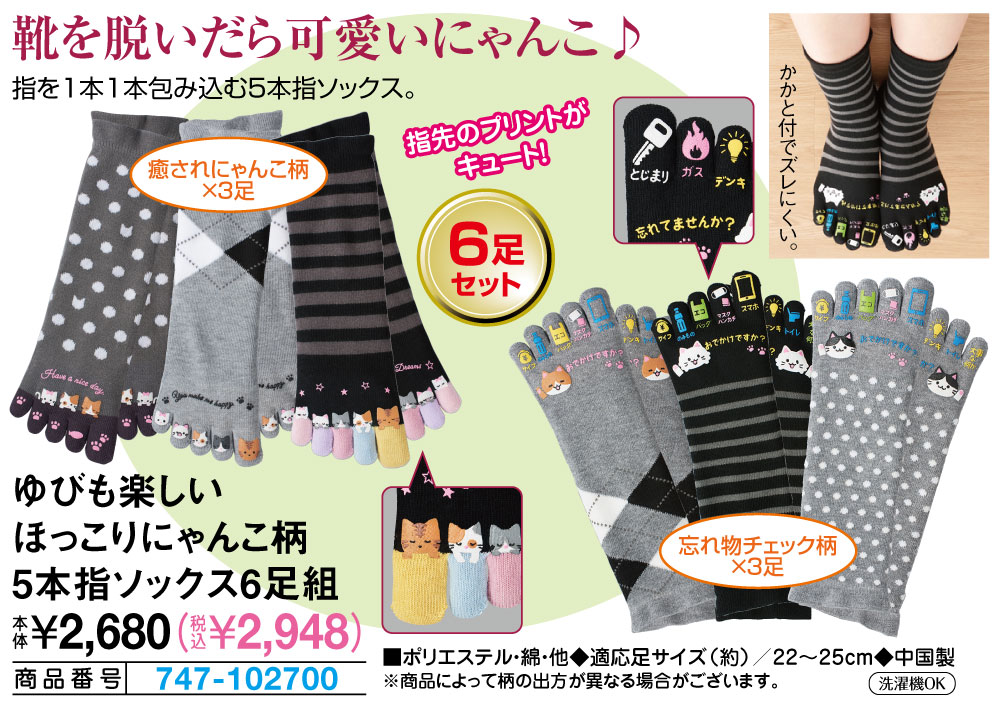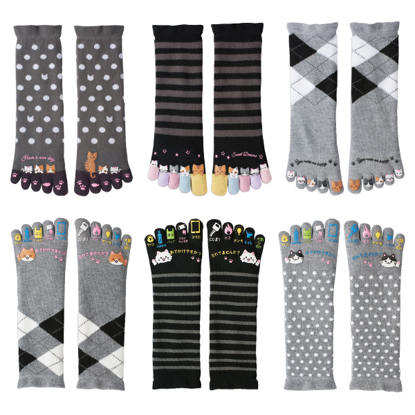 靴を脱いだら可愛いにゃんこ! 指を1本1本包み込む5本指ソックス。 かかと付でズレにくい。 指先のプリントがキュート! ●6足セット