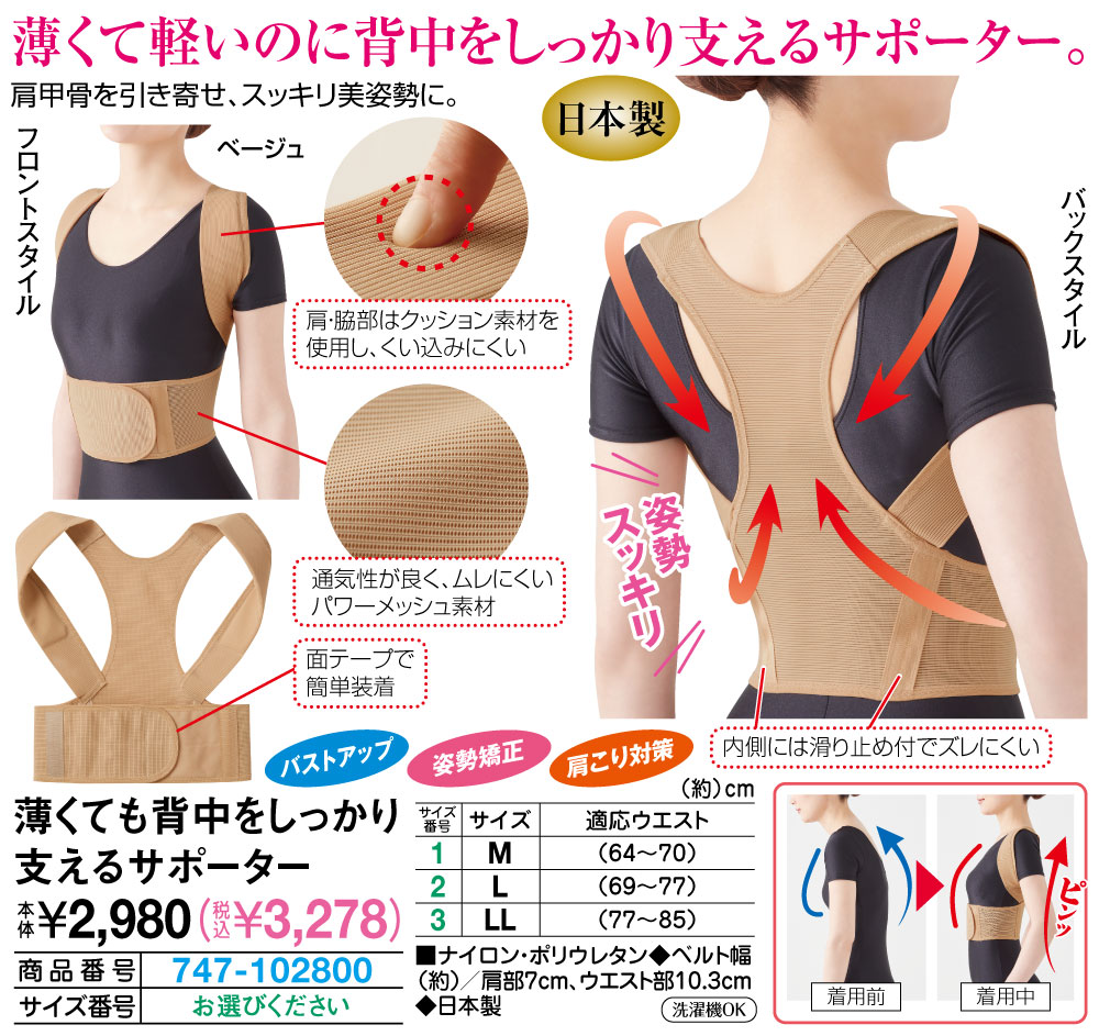 薄くて軽いのに背中をしっかり支えるサポーター!