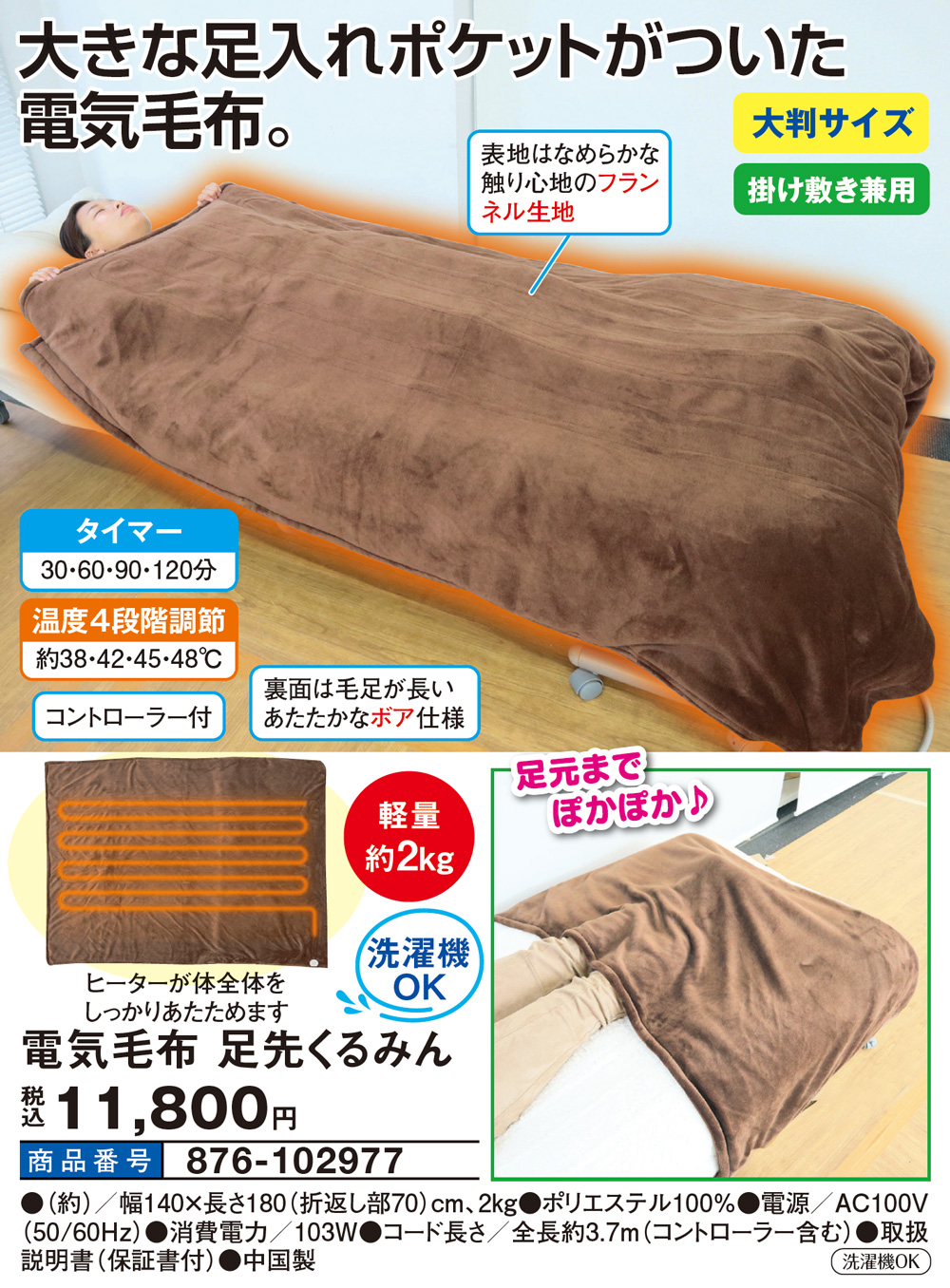 大きな足入れポケットがついた電気毛布。 【タイマー】 30・60・90・120分 【温度4段階調節】 約38・42・45・48℃ 表地はなめらかな触り心地のフランネル生地 大判サイズ 足元までぽかぽか♪ ◎軽量:約2kg ◎洗濯機OK