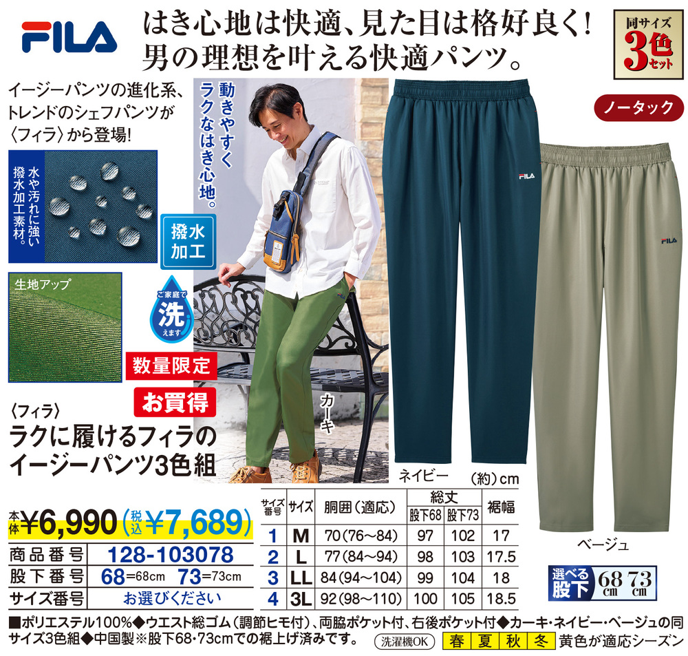 はき心地は快適、見た目は格好良く!男の理想を叶える快適パンツ! イージーパンツの進化系、トレンドのシェフパンツが<フィラ>から登場! 動きやすくラクなはき心地。 水や汚れに強い撥水加工素材。 ●撥水加工 ●ノータック ●同サイズ3色セット