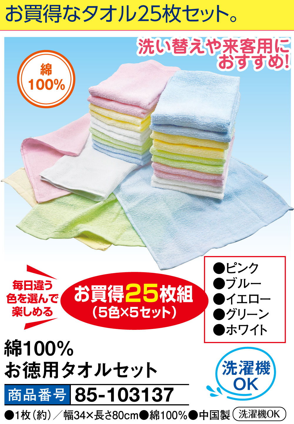 洗い替えや来客用におすすめ!綿100%タオルの25枚セット! 毎日違う色を選んで楽しめるお買得25枚組(5色×5セット) ●ピンク ●ブルー ●イエロー ●グリーン ●ホワイト